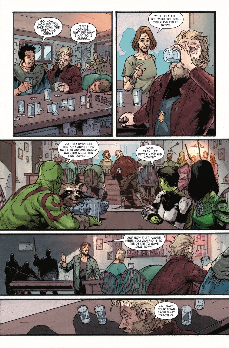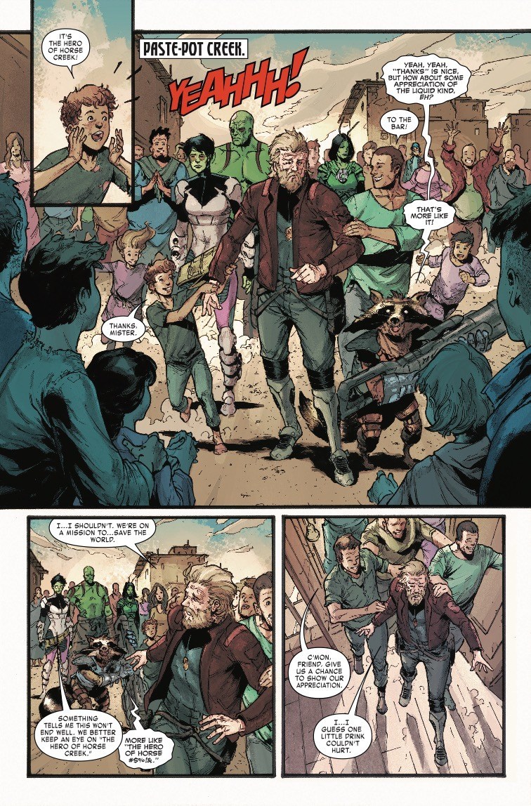 Well, probably not. But we do see this in a preview of next week's Old Man Quill #3, wherein Star-Lord is heralded as a savior of the wastelands, leading Rocket Raccoon to encourage him to indulge in some heavy drinking…