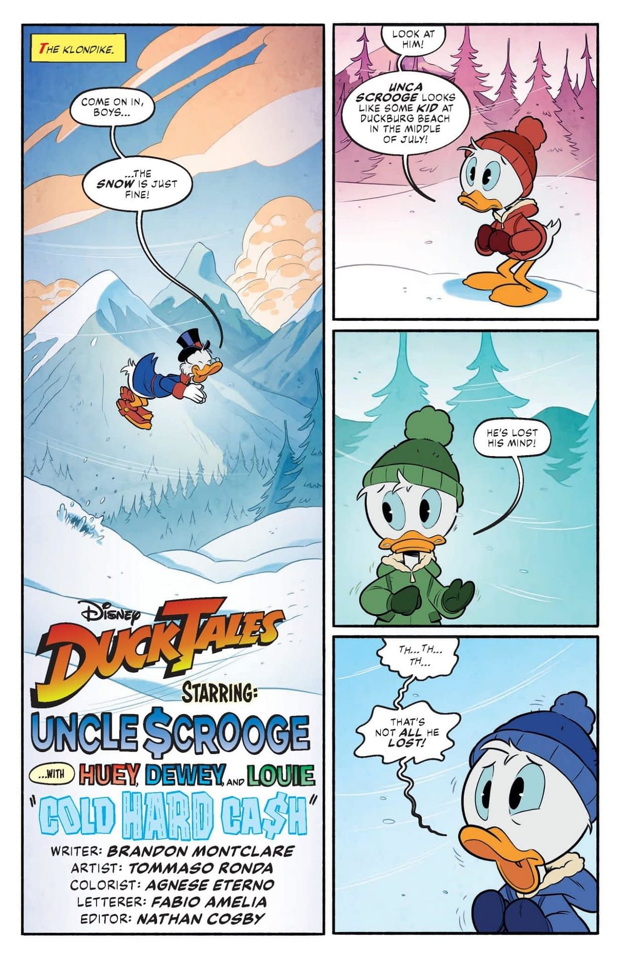 THERE'S GOLD IN THOSE FROZEN HILLS! Uncle Scrooge is hot on the trail of cold, hard cash in his long-awaited return to the snowy Klondike! Somewhere in the northern wilds there's a fortune waiting to be found — and Scrooge would know, because he stashed it there decades ago when he wasn't much older than his plucky nephews, Huey, Dewey, and Louie! Now the world's richest duck is itching to retrieve his long-lost gold — and maybe recapture some of the golden spirit of his youth. But it turns out that the tundra isn't what it used to be. Clues have shifted, landmarks have vanished, and the only thing deeper than the snow is the mystery of where Scrooge's secret cache is actually buried — and what else from his past he might dig up! Grizzled prospectors BRANDON MONTCLARE and TOMMASO RONDA unearth a wealth of adventures from Scrooge's storied past in DuckTales #11 — blanketed by a blizzard of covers by RONDA, IVAN BIGARELLA, FRANCESCO TOMASELLI, CARLO LAURO, and DREW MOSS!