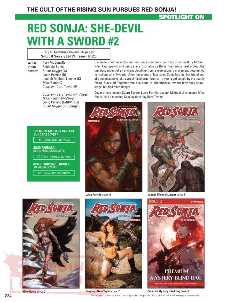 Welcome to Altered States… Dynamite Entertainment's parallel reality in the vein of DC's Elseworlds and Marvel's What If! Our debut Altered States title starts with Red Sonja, the She-Devil of Hyrkania, finding herself transported to Barsoom – better known to Earth-readers as Mars – in the ancient past of the mysterious red planet! What happens there sets up events that will ripple across the planet and will draw in the legendary heroes Vampirella, John Carter, Dejah Thoris, and, direct from Earth, the Lord of the Jungle himself! Writer David Avallone (Elvira, Savage Tales) is joined by rising star Mariano Benitez-Chapo (Vampirella, Elvira, Savage Tales) and cover artists Joseph Michael Linsner, Mike Rooth, and Chapo, as well as a stunning cosplay image by Jackie Goehner! Plus: Mike Rooth and Chapo each have created a stunning series of connecting covers for this series! It all starts in June! Be there! $4.99 6/10/2026