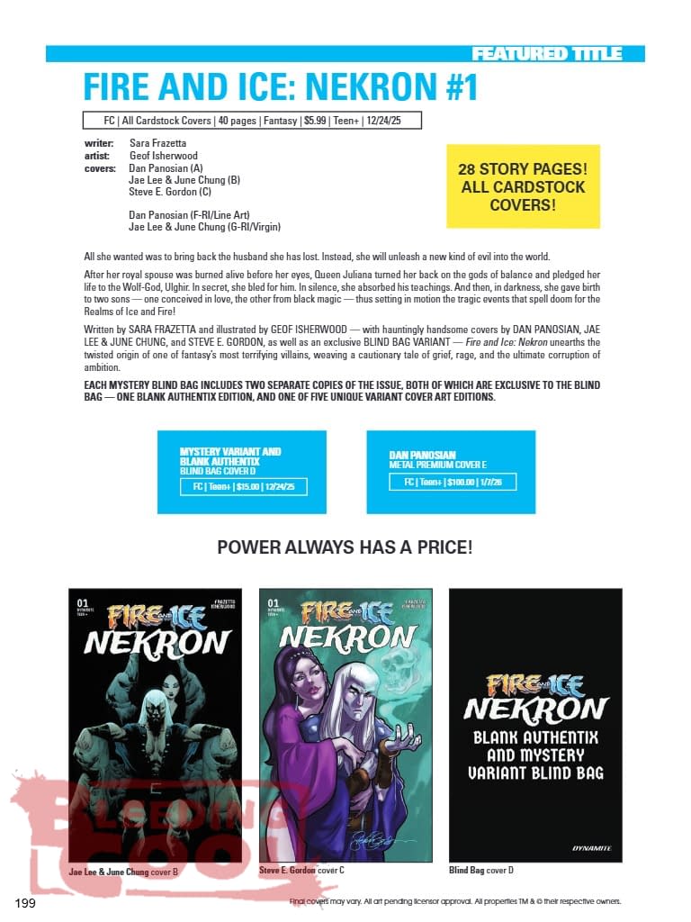 All she wanted was to bring back the husband she has lost. Instead, she will unleash a new kind of evil into the world. After her royal spouse was burned alive before her eyes, Queen Juliana turned her back on the gods of balance and pledged her life to the Wolf-God, Ulghir. In secret, she bled for him. In silence, she absorbed his teachings. And then, in darkness, she gave birth to two sons — one conceived in love, the other from black magic — thus setting in motion the tragic events that spell doom for the Realms of Ice and Fire! Written by SARA FRAZETTA and illustrated by GEOFF ISHERWOOD — with hauntingly handsome covers by DAN PANOSIAN, JAE LEE & JUNE CHUNG, and STEVE E. GORDON, as well as an exclusive BLIND BAG VARIANT — Fire and Ice: Nekron unearths the twisted origin of one of fantasy's most terrifying villains, weaving a cautionary tale of grief, rage, and the ultimate corruption of ambition. EACH MYSTERY BLIND BAG INCLUDES TWO SEPARATE COPIES OF THE ISSUE, BOTH OF WHICH ARE EXCLUSIVE TO THE BLIND BAG — ONE BLANK AUTHENTIX EDITION, AND ONE OF FIVE UNIQUE VARIANT COVER ART EDITIONS.
