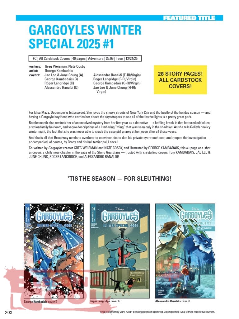 For Elisa Maza, December is bittersweet. She loves the snowy streets of New York City and the bustle of the holiday season — and having a Gargoyle boyfriend who carries her above the skyscrapers to see all of the festive lights is a pretty great perk. But the month also reminds her of an unsolved mystery from her first year as a detective — a baffling break-in that featured odd clues, a stolen family heirloom, and vague descriptions of a lumbering "thing" that was seen only in the shadows. As she tells Goliath one icy winter night, the fact that she was never able to crack the case still gnaws at her, even after all these years. And that's all that Broadway needs to overhear to convince him to don his private eye trench coat and reopen the investigation — accompanied, of course, by Bronx and his bull terrier pal, Lance! Co-written by Gargoyles creator GREG WEISMAN and NATE COSBY, and illustrated by GEORGE KAMBADAIS, this 40-page one-shot uncovers a chilly new chapter in the saga of the Stone Guardians — frosted with crystalline covers from KAMBADAIS, JAE LEE & JUNE CHUNG, ROGER LANGRIDGE, and ALESSANDRO RANALDI! BROADWAY AND BRONX SET OUT TO SOLVE THE COLDEST OF COLD CASES IN THIS 40-PAGE SEASONAL ONE-SHOT! WRITTEN BY GARGOYLES CREATOR GREG WEISMAN AND NATE COSBY AND ILLUSTRATED BY GEORGE KAMBADAIS! FEATURING COVERS BY JAE LEE, GEORGE KAMBADAIS, ROGER LANGRIDGE, AND ALESSANDRO RANALDI