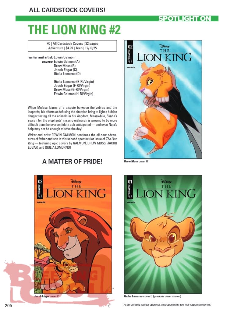 When Mufasa learns of a dispute between the zebras and the leopards, his efforts at defusing the situation bring to light a hidden danger facing all the animals in his kingdom. Meanwhile, Simba's search for the elephants' missing matriarch is proving to be more difficult than the overconfident cub anticipated — and even Nala's help may not be enough to save the day! Writer and artist EDWIN GALMON continues the all-new adventures of father and son in this second spectacular issue of The Lion King — featuring epic covers by GALMON, DREW MOSS, JACOB EDGAR, and GIULIA LOMURNO!