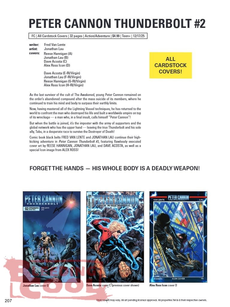 As the last survivor of the cult of The Awakened, young Peter Cannon remained on the order's abandoned compound after the mass suicide of its members, where he continued to train his mind and body to surpass their earthly limits. Now, having mastered all of the Lightning Vessel techniques, he has returned to the world to confront the man who destroyed his life and built a worldwide empire on top of its wreckage — a man who, in a final insult, calls himself "Peter Cannon"! But when the battle is joined, it's the imposter with the army of supporters and the global network who has the upper hand — leaving the true Thunderbolt and his sole ally, Tabu, in a desperate race to survive the Destroyer of Death! Comic book black belts FRED VAN LENTE and JONATHAN LAU continue their high-kicking adventure in Peter Cannon Thunderbolt #2, featuring flawlessly executed cover art by REESE HANNIGAN, JONATHAN LAU, and DAVE ACOSTA, as well as a special Icon image from ALEX ROSS!
