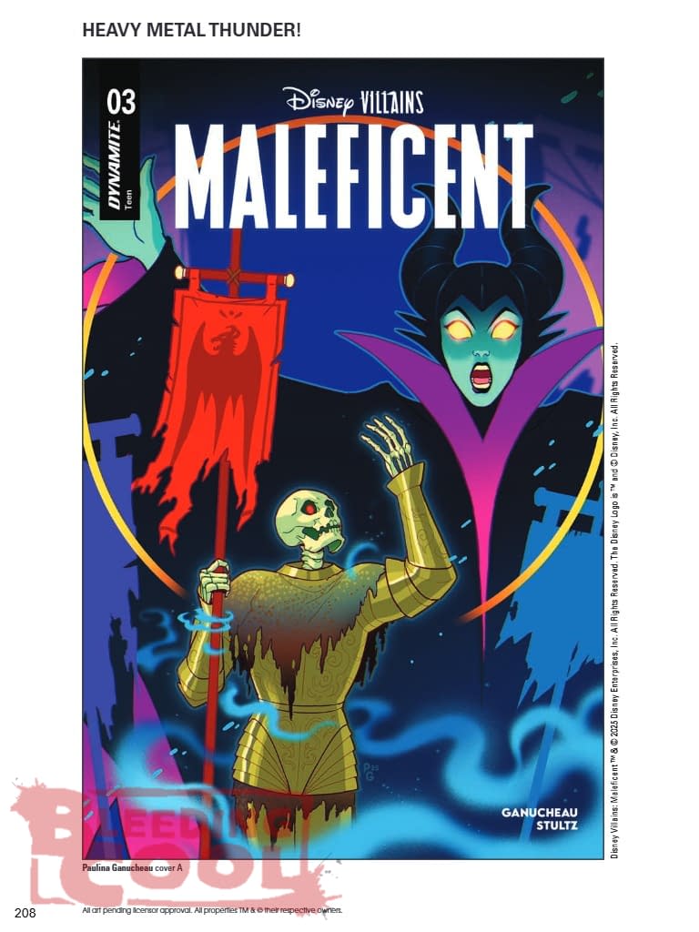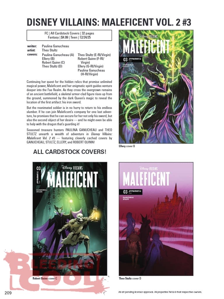 Continuing her quest for the hidden relics that promise unlimited magical power, Maleficent and her enigmatic spirit guides venture deeper into the Fae Realm. As they cross the overgrown remains of an ancient battlefield, a skeletal armor-clad figure rises up from the ground, summoned by the dark Queen's magic to reveal the location of the first artifact: his iron sword. But the reanimated soldier is in no hurry to return to his endless slumber. If he can join Maleficent's company for one last adventure, he promises that he can secure for her not only his sword, but also the second object of her desire — and he might even be able to help with the dragon that's guarding it! Seasoned treasure hunters PAULINA GANUCHEAU and THEO STULTZ unearth a wealth of adventure in Disney Villains: Maleficent Vol. 2 #3 — featuring cleverly cached covers by GANUCHEAU, STULTZ, ELLERY, and ROBERT QUINN!