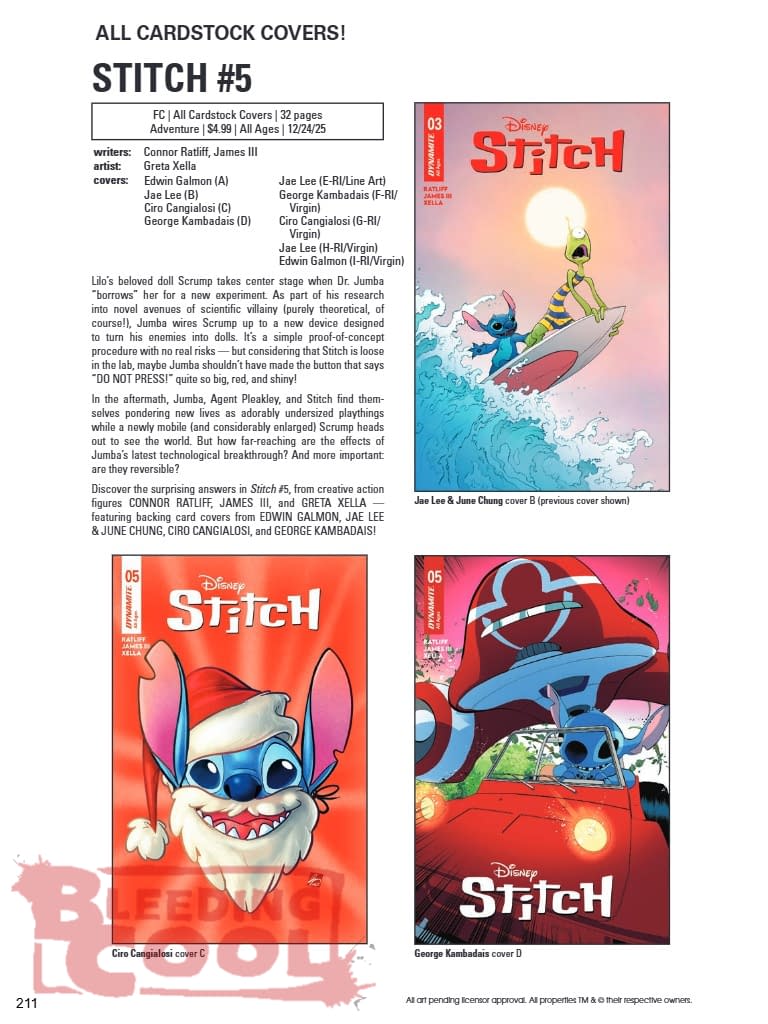 Lilo's beloved doll Scrump takes center stage when Dr. Jumba "borrows" her for a new experiment. As part of his research into novel avenues of scientific villainy (purely theoretical, of course!), Jumba wires Scrump up to a new device designed to turn his enemies into dolls. It's a simple proof-of-concept procedure with no real risks — but considering that Stitch is loose in the lab, maybe Jumba shouldn't have made the button that says "DO NOT PRESS!" quite so big, red, and shiny! In the aftermath, Jumba, Agent Pleakley, and Stitch find themselves pondering new lives as adorably undersized playthings while a newly mobile (and considerably enlarged) Scrump heads out to see the world. But how far-reaching are the effects of Jumba's latest technological breakthrough? And more important: are they reversible? Discover the surprising answers in Stitch #5, from creative action figures CONNOR RATLIFF, JAMES III, and GRETA XELLA — featuring backing card covers from EDWIN GALMON, JAE LEE & JUNE CHUNG, CIRO CANGIALOSI, and GEORGE KAMBADAIS!