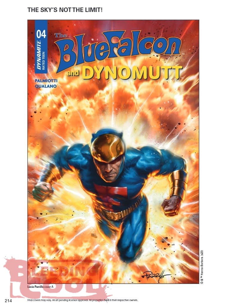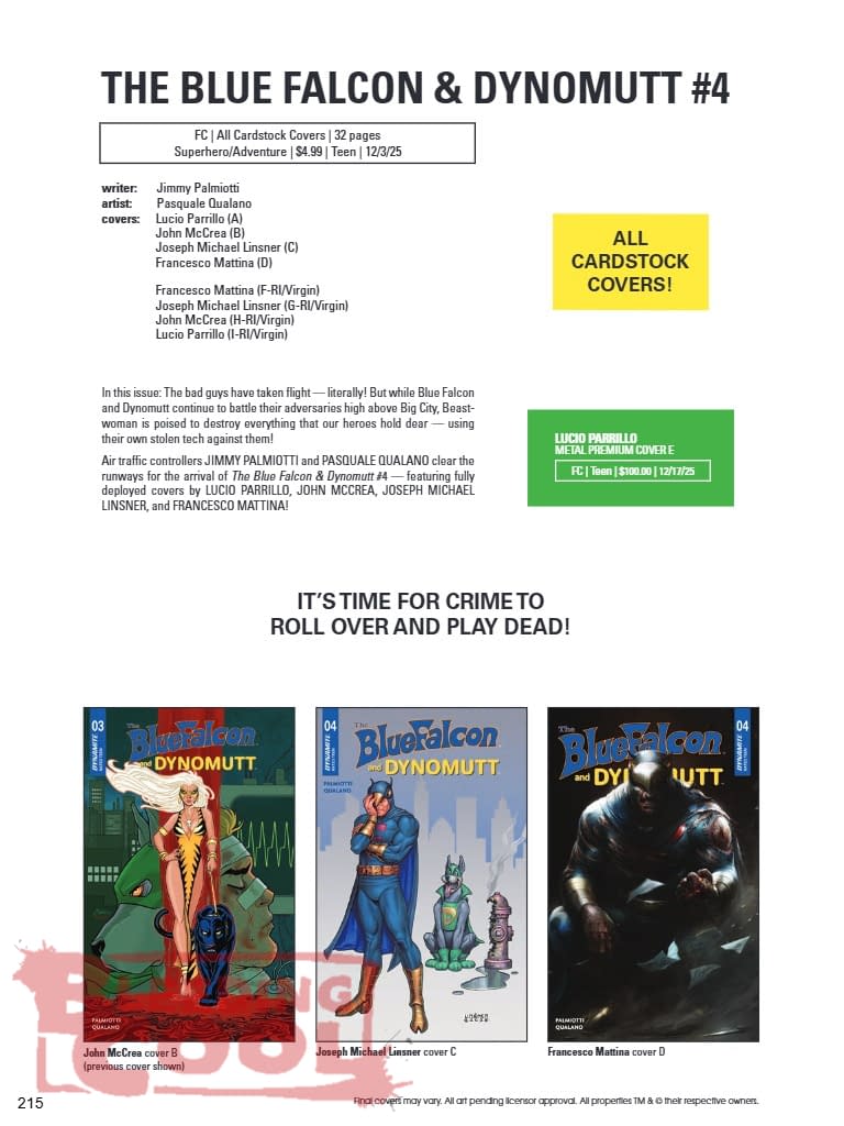 In this issue: The bad guys have taken flight — literally! But while Blue Falcon and Dynomutt continue to battle their adversaries high above Big City, Beastwoman is poised to destroy everything that our heroes hold dear — using their own stolen tech against them! Air traffic controllers JIMMY PALMIOTTI and PASQUALE QUALANO clear the runways for the arrival of The Blue Falcon & Dynomutt #4 — featuring fully deployed covers by LUCIO PARRILLO, JOHN MCCREA, JOSEPH MICHAEL LINSNER, and FRANCESCO MATTINA!