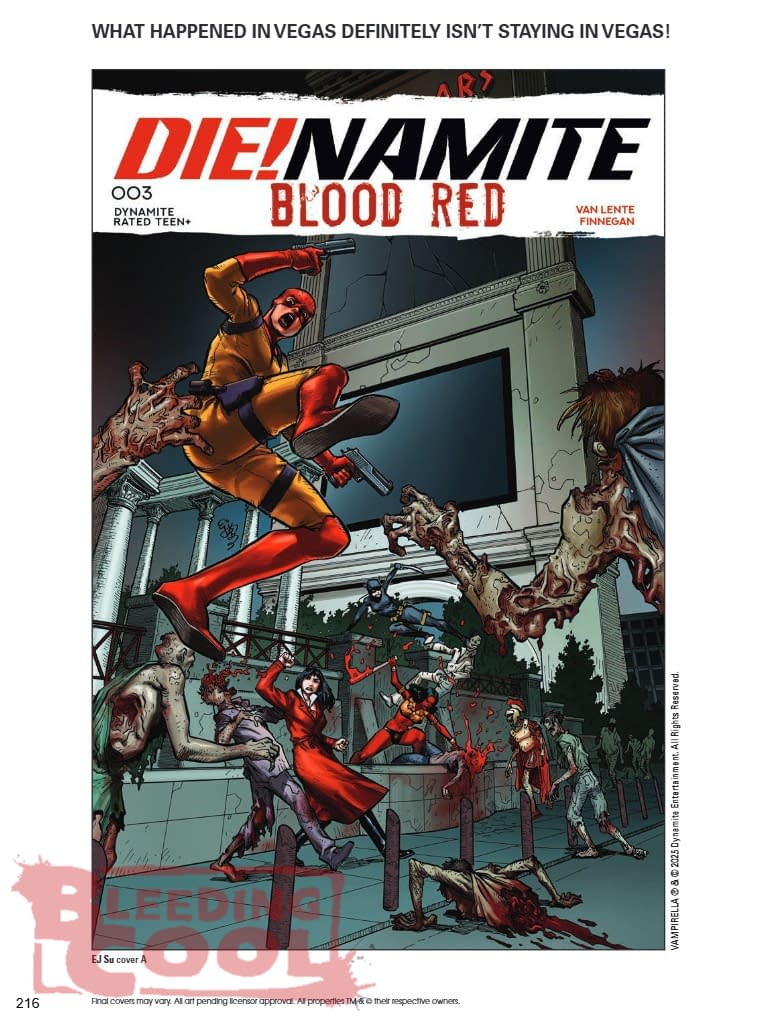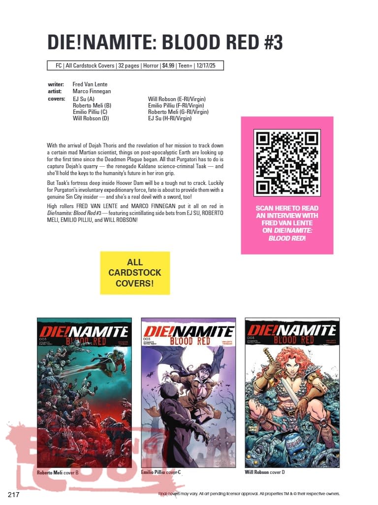 With the arrival of Dejah Thoris and the revelation of her mission to track down a certain mad Martian scientist, things on post-apocalyptic Earth are looking up for the first time since the Deadmen Plague began. All that Purgatori has to do is capture Dejah's quarry — the renegade Kaldane science-criminal Taak — and she'll hold the keys to the humanity's future in her iron grip. But Taak's fortress deep inside Hoover Dam will be a tough nut to crack. Luckily for Purgatori's involuntary expeditionary force, fate is about to provide them with a genuine Sin City insider — and she's a real devil with a sword, too! High rollers FRED VAN LENTE and MARCO FINNEGAN put it all on red in Die!namite: Blood Red #3 — featuring scintillating side bets from EJ SU, ROBERTO MELI, EMILIO PILLIU, and WILL ROBSON! SCAN HERE TO READ AN INTERVIEW WITH FRED VAN LENTE ON DIE!NAMITE: BLOOD RED!