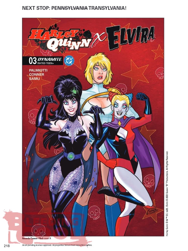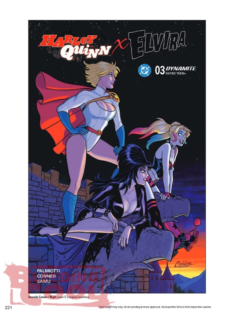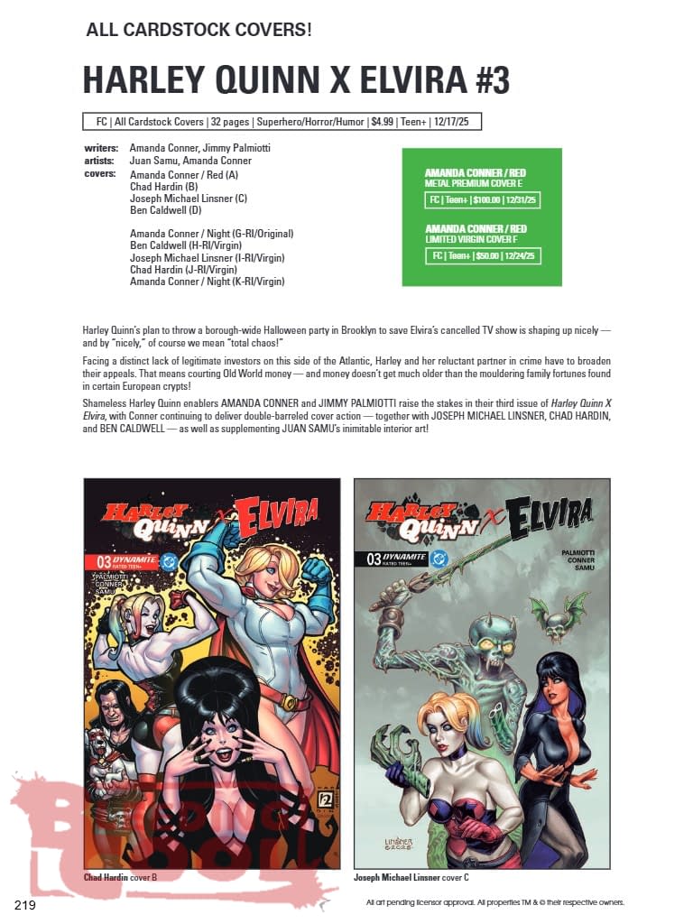 Harley Quinn's plan to throw a borough-wide Halloween party in Brooklyn to save Elvira's cancelled TV show is shaping up nicely — and by "nicely," of course we mean "total chaos!" Facing a distinct lack of legitimate investors on this side of the Atlantic, Harley and her reluctant partner in crime have to broaden their appeals. That means courting Old World money — and money doesn't get much older than the mouldering family fortunes found in certain European crypts! Shameless Harley Quinn enablers AMANDA CONNER and JIMMY PALMIOTTI raise the stakes in their third issue of Harley Quinn X Elvira, with Conner continuing to deliver double-barreled cover action — together with JOSEPH MICHAEL LINSNER, CHAD HARDIN, and BEN CALDWELL — as well as supplementing JUAN SAMU's inimitable interior art!