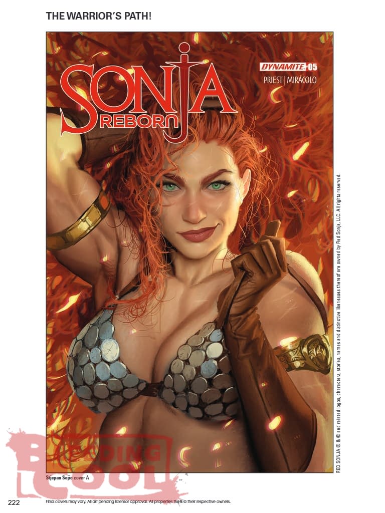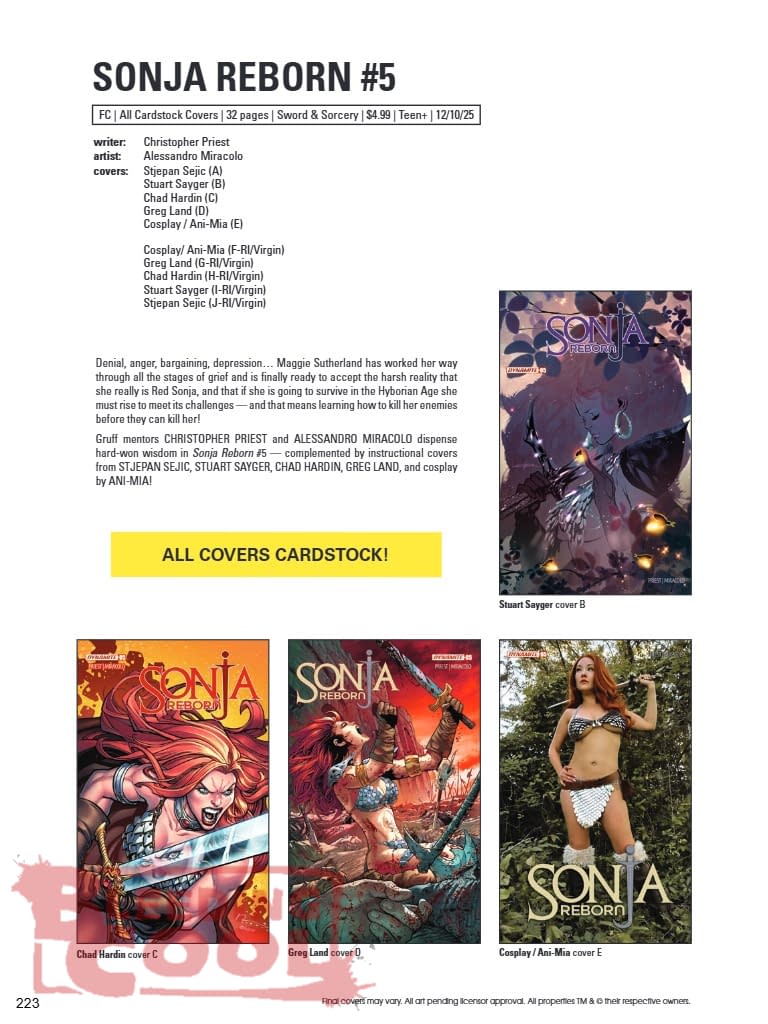 Denial, anger, bargaining, depression… Maggie Sutherland has worked her way through all the stages of grief and is finally ready to accept the harsh reality that she really is Red Sonja, and that if she is going to survive in the Hyborian Age she must rise to meet its challenges — and that means learning how to kill her enemies before they can kill her! Gruff mentors CHRISTOPHER PRIEST and ALESSANDRO MIRACOLO dispense hard-won wisdom in Sonja Reborn #5 — complemented by instructional covers from STJEPAN SEJIC, STUART SAYGER, CHAD HARDIN, GREG LAND, and cosplay by ANI-MIA!