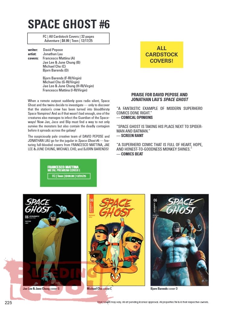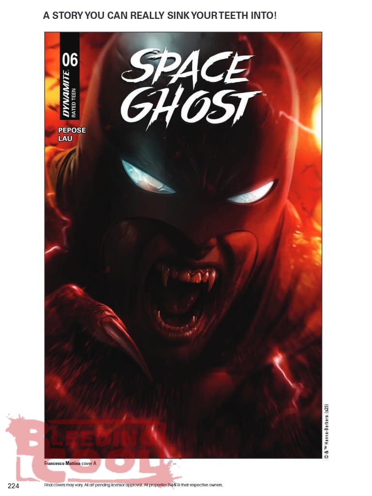 When a remote outpost suddenly goes radio silent, Space Ghost and the twins decide to investigate — only to discover that the station's crew has been turned into bloodthirsty Space Vampires! And as if that wasn't bad enough, one of the creatures also manages to infect the Guardian of the Spaceways! Now Jan, Jace and Blip must find a way to not only survive the monsters but also contain the deadly contagion before it spreads across the galaxy! The suspiciously pale creative team of DAVID PEPOSE and JONATHAN LAU go for the jugular in Space Ghost #6 — featuring full-blooded covers from FRANCESCO MATTINA, JAE LEE & JUNE CHUNG, MICHAEL CHO, and BJORN BARENDS! PRAISE FOR DAVID PEPOSE AND JONATHAN LAU'S SPACE GHOST "A FANTASTIC EXAMPLE OF MODERN SUPERHERO COMICS DONE RIGHT." — COMICAL OPINIONS "SPACE GHOST IS TAKING HIS PLACE NEXT TO SPIDER-MAN AND BATMAN." — SCREEN RANT "A SUPERHERO COMIC THAT IS FULL OF HEART, HOPE, AND HONEST-TO-GOODNESS MONKEY SHINES." — COMICS BEAT