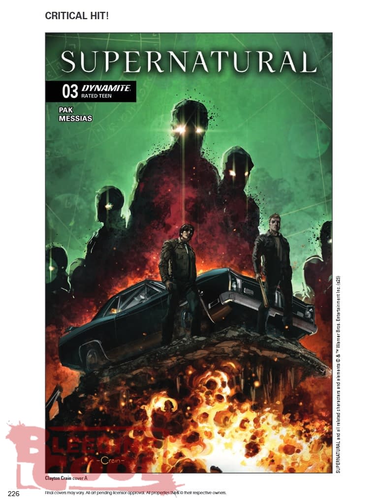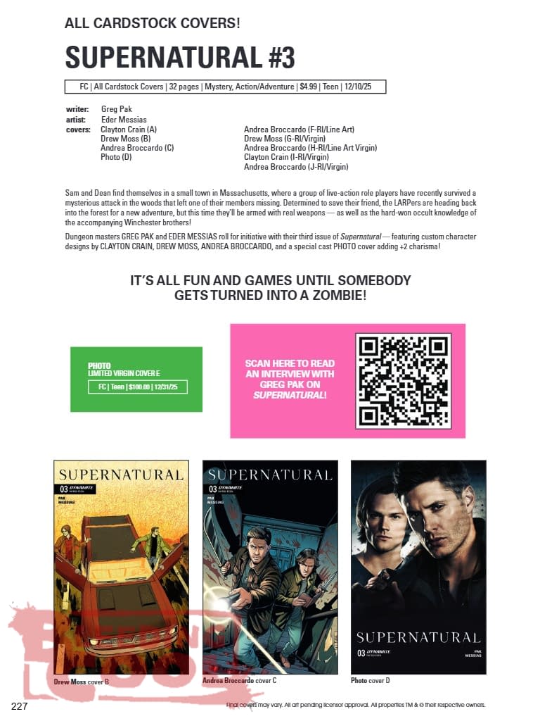 Sam and Dean find themselves in a small town in Massachusetts, where a group of live-action role players have recently survived a mysterious attack in the woods that left one of their members missing. Determined to save their friend, the LARPers are heading back into the forest for a new adventure, but this time they'll be armed with real weapons — as well as the hard-won occult knowledge of the accompanying Winchester brothers! Dungeon masters GREG PAK and EDER MESSIAS roll for initiative with their third issue of Supernatural — featuring custom character designs by CLAYTON CRAIN, DREW MOSS, ANDREA BROCCARDO, and a special cast PHOTO cover adding +2 charisma! SCAN HERE TO READ AN INTERVIEW WITH GREG PAK ON SUPERNATURAL!