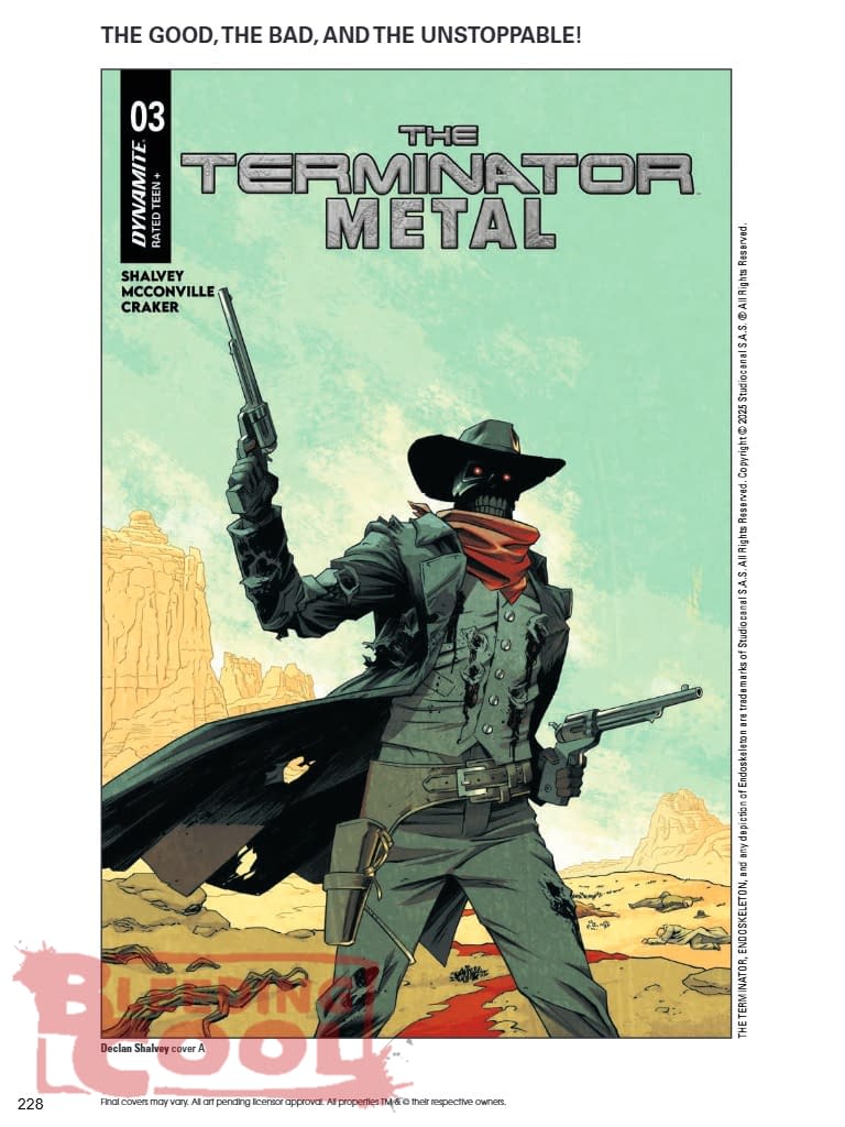 Skynet may be an all-powerful AI with nigh-unlimited computing power, but time travel is still an inexact science. And with so many mechanical assassins sent into the past, some are bound to miss their mark by a few days… or months… or decades. When that happens, there are contingency protocols that kick in. Units switch to secondary targets, or find a place of concealment, power down, and wait —for as long as their programming deems necessary. The group of prospectors who uncover one such dormant Terminator on the side of an Oregon mountain in 1889 are, of course, blissfully unaware of this chain of events. But unfortunately for them, the first electric power station in the area has just come online — and they're now standing between a T-800 and the energy it desperately needs to continue its mission! Local sheriff DECLAN SHALVEY and deputy RORY MCCONVILLE form a creative posse with quick-draw artist COLIN CRAKER for The Terminator: Metal #3 — featuring a fistful of covers from SHALVEY, BOB LAYTON, SEBASTIAN PIRIZ, and PAOLO ANTIGA! PRAISE FOR DECLAN SHALVEY'S THE TERMINATOR "DYNAMITE HAS DONE THE IMPOSSIBLE: IT'S MADE ME A TERMINATOR FAN AGAIN." — AIPT SCAN HERE TO READ AN INTERVIEW WITH DECLAN SHALVEY ON THE TERMINATOR: METAL!