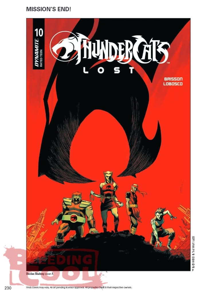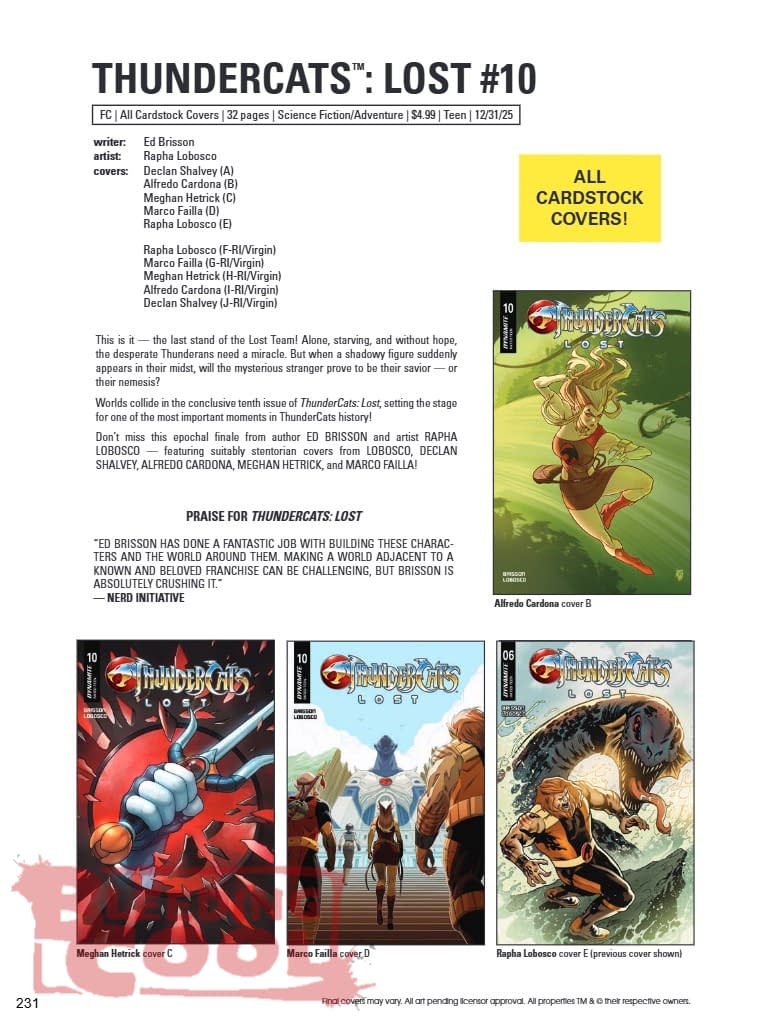 This is it — the last stand of the Lost Team! Alone, starving, and without hope, the desperate Thunderans need a miracle. But when a shadowy figure suddenly appears in their midst, will the mysterious stranger prove to be their savior — or their nemesis? Worlds collide in the conclusive tenth issue of ThunderCats: Lost, setting the stage for one of the most important moments in ThunderCats history! Don't miss this epochal finale from author ED BRISSON and artist RAPHA LOBOSCO — featuring suitably stentorian covers from LOBOSCO, DECLAN SHALVEY, ALFREDO CARDONA, MEGHAN HETRICK, and MARCO FAILLA! PRAISE FOR THUNDERCATS: LOST "ED BRISSON HAS DONE A FANTASTIC JOB WITH BUILDING THESE CHARACTERS AND THE WORLD AROUND THEM. MAKING A WORLD ADJACENT TO A KNOWN AND BELOVED FRANCHISE CAN BE CHALLENGING, BUT BRISSON IS ABSOLUTELY CRUSHING IT." — NERD INITIATIVE