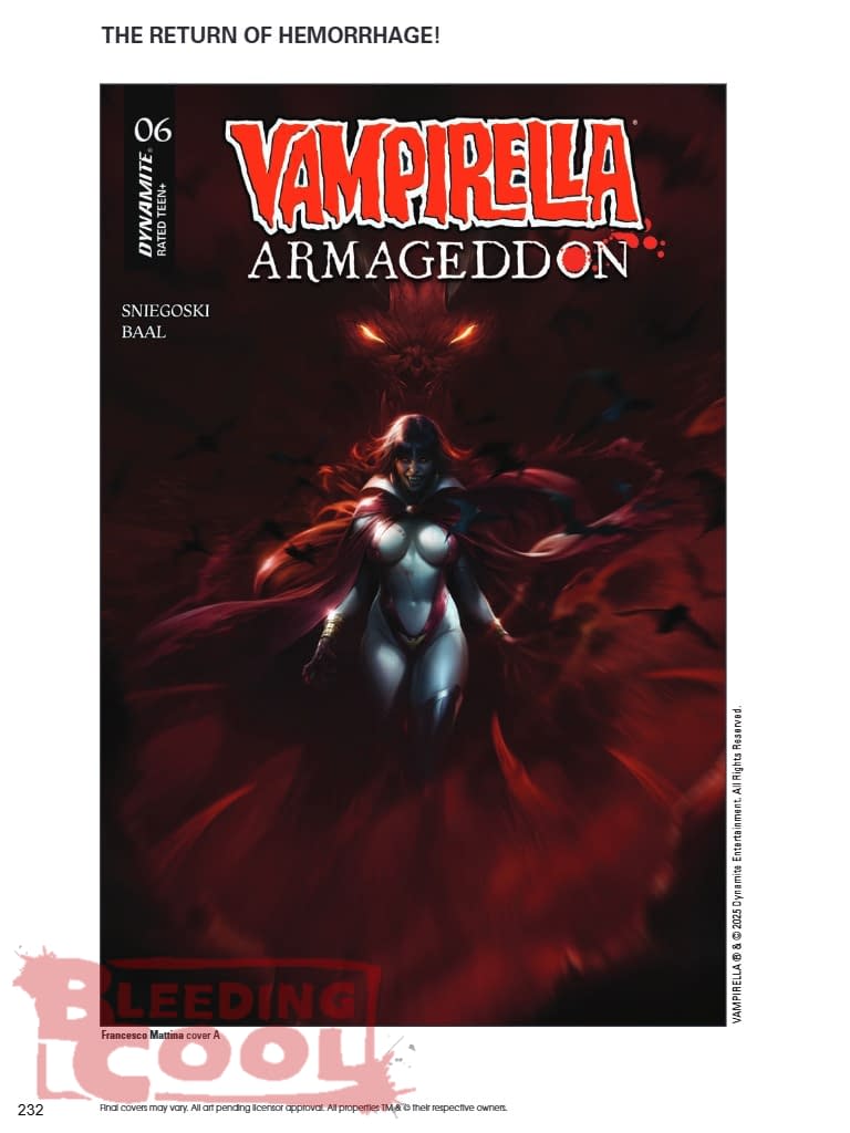 As Vampirella and Walker continue to make their way across the burning plains of Hell and fight through its hostile hordes, a vision of Vampirella's mother, Lilith, plagues the Daughter of Drakulon. Meanwhile, more heroes from Sepulcher City are heading down to the increasingly popular infernal realm — where people are literally dying to get in! Veteran Vampi chronicler TOM SNIEGOSKI is joined by returning all-star artist EDU MENNA for the sixth issue of Vampirella: Armageddon — all clad in coruscating covers from FRANCESCO MATTINA, LESLEY "LEIRIX" LI, JOSEPH MICHAEL LINSNER, and fiery cosplay from IRELAND REID!