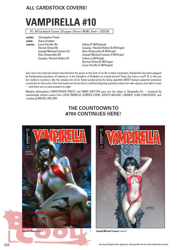 Ever since her long-lost friend returned from the grave in the form of an AI-created automaton, Vampirella has been plagued by fundamental questions of existence. Is the Daughter of Drakulon an actual person? Does she have a soul? Or is she just her mother's construct, like the simulacrum of her friend produced by the living algorithm ARIS? Vampi's powerful emotional connection to this echo of her lost loved one forces her to confront lingering questions about her own agency and right to exist — and there are no easy answers in sight. Weighty philosophers CHRISTOPHER PRIEST and DAVIS GOETTEN gaze into the abyss in Vampirella #10 — leavened by reassuringly refined covers from LUCIO PARRILLO, DERRICK CHEW, JOSEPH MICHAEL LINSNER, ELIAS CHATZOUDIS, and cosplay by RACHEL HOLLON!