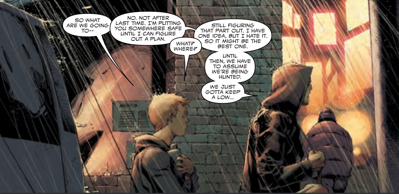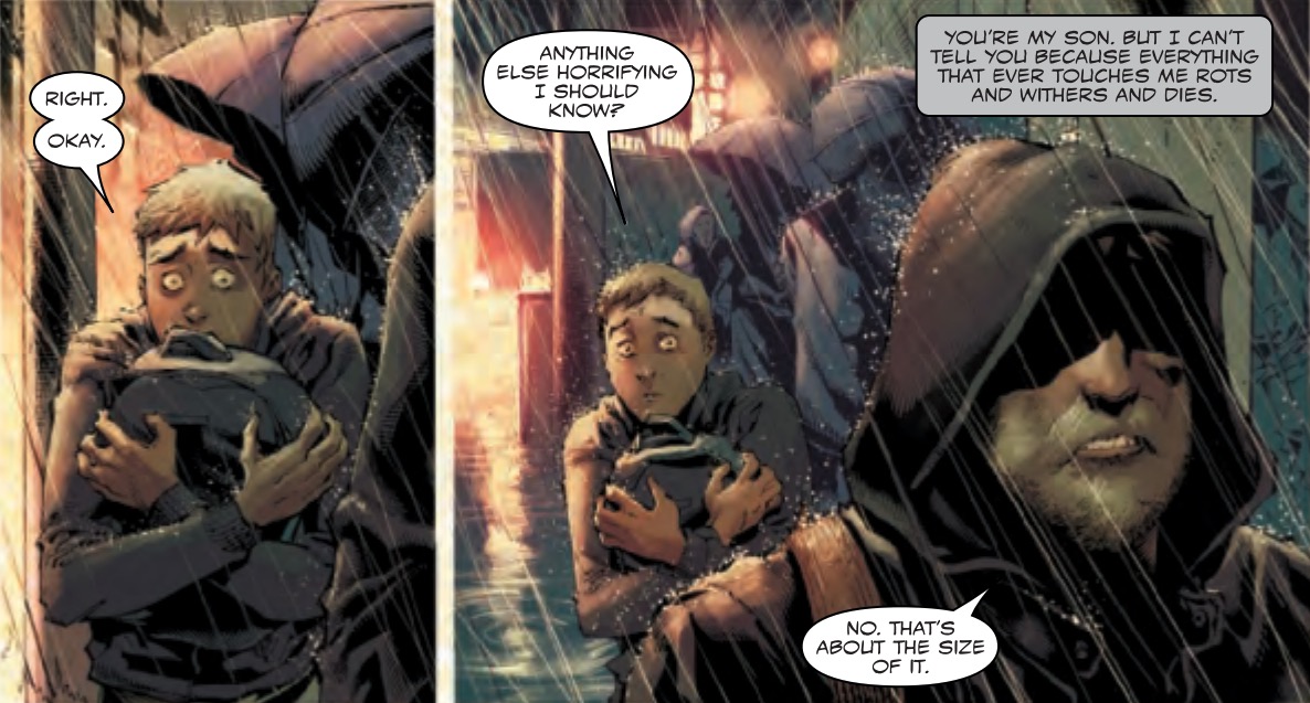 And he does, to his credit, recognize that his parental duties require he get his son as far away from this super-mega-crossover event as possible.