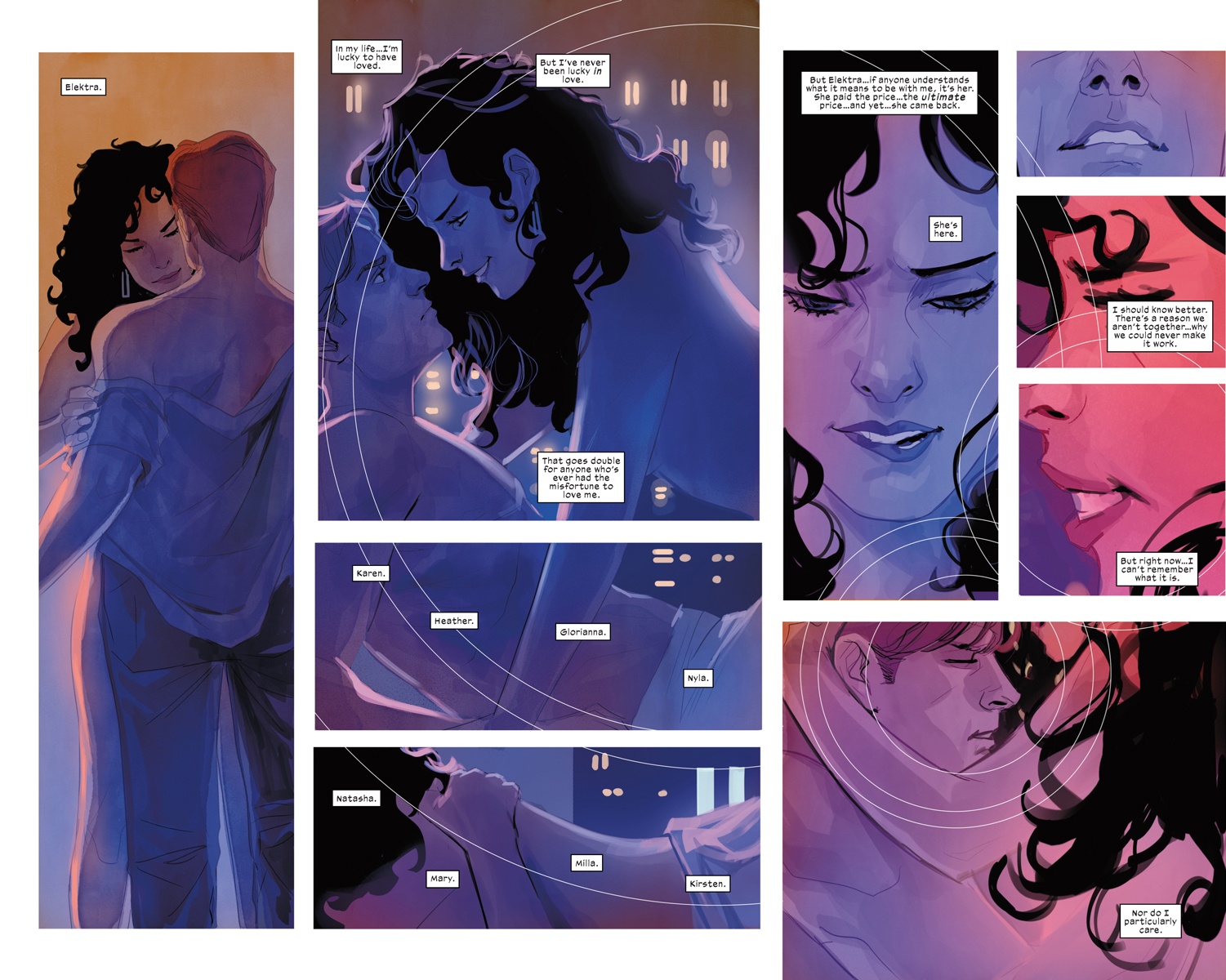 As to whether Daredevil will actually "die" in the story, and how it might happen, perhaps Elektra kills him after finding out he spent their intimate moment thinking about all his other ex-girlfriends?