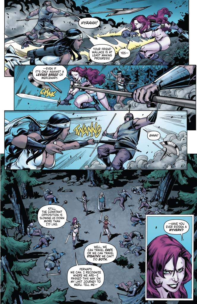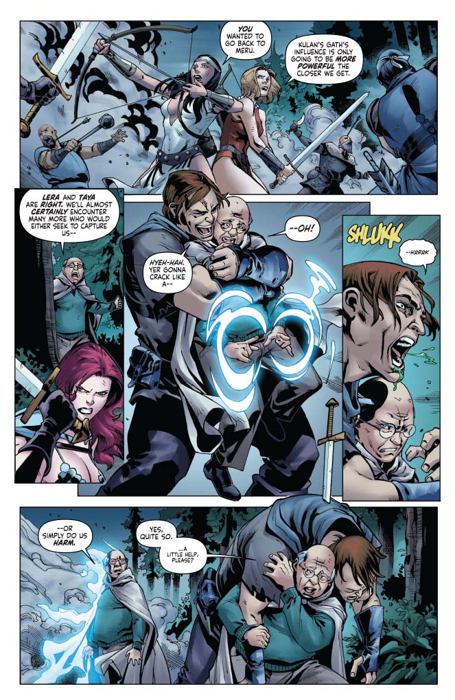 Sonja, Professor Wallace, and their new comrades Taya and Lera are returning to Meru and finding themselves facing more and more thugs enhanced by the power of Kulan Gath. It's a problem.