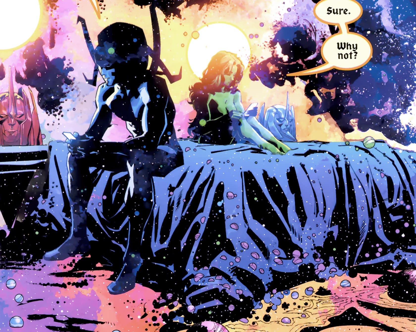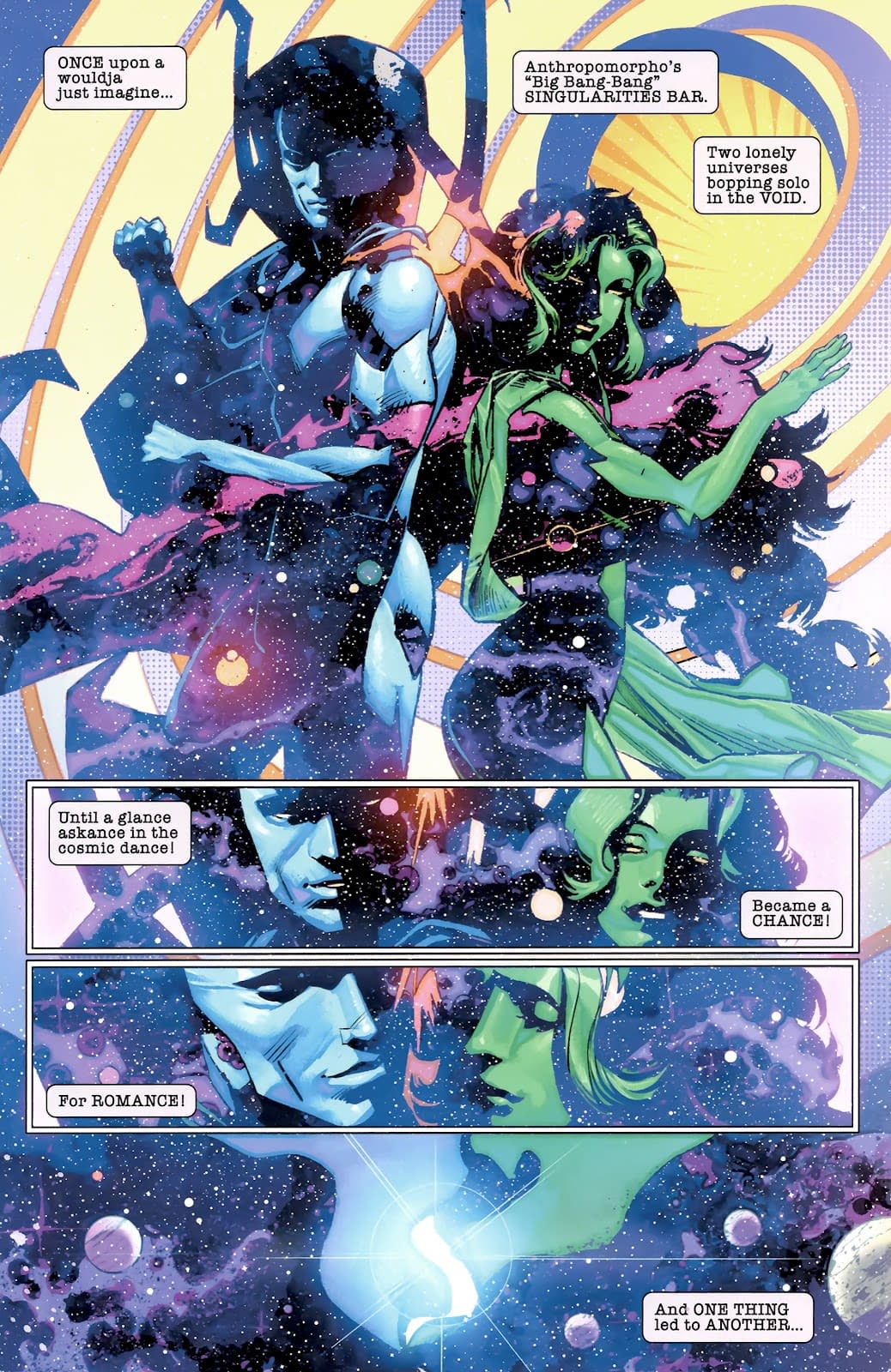 - Grant Morrison and Dan Mora use universe embodiments' romance as the spark for a new Marvel/DC storyline.