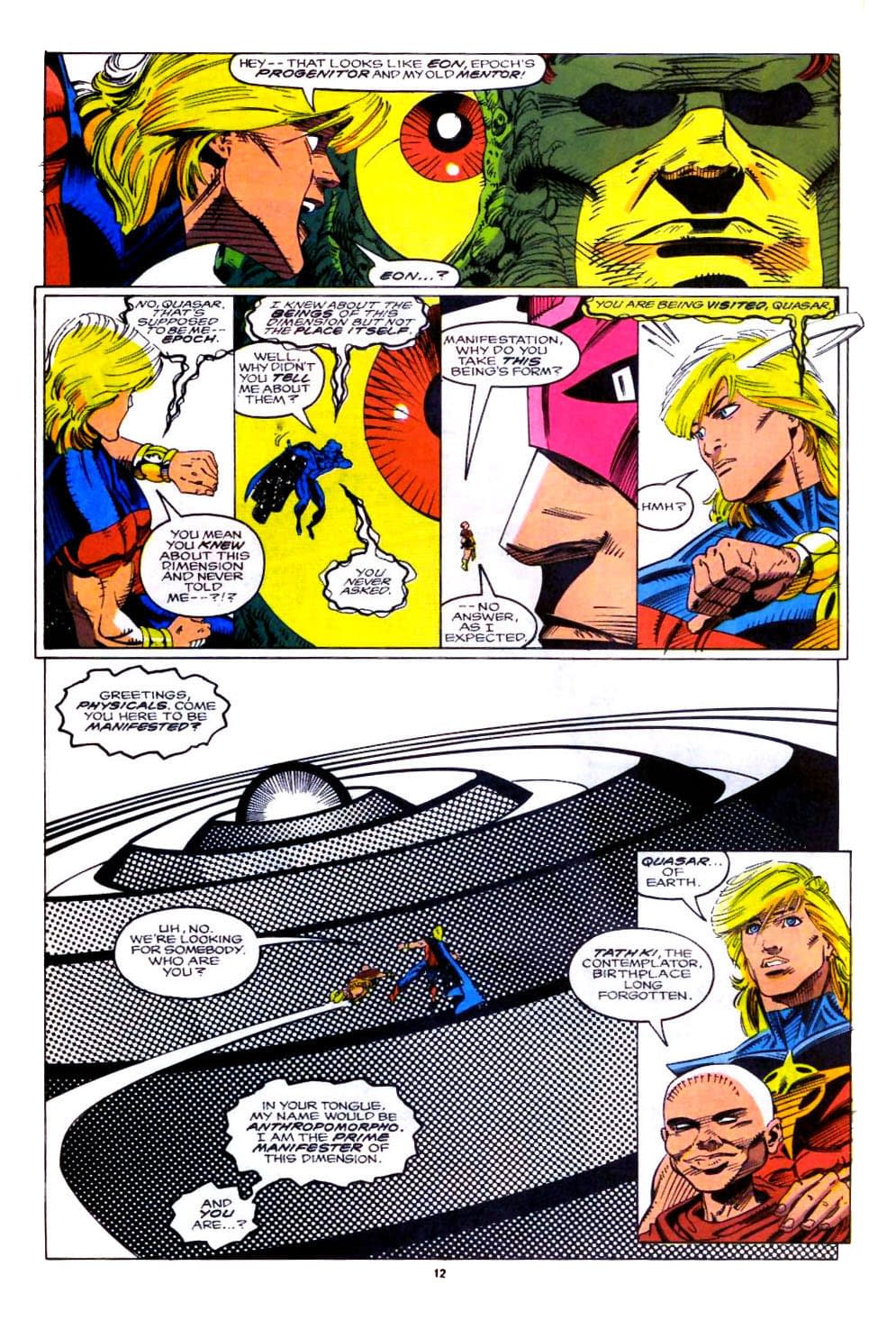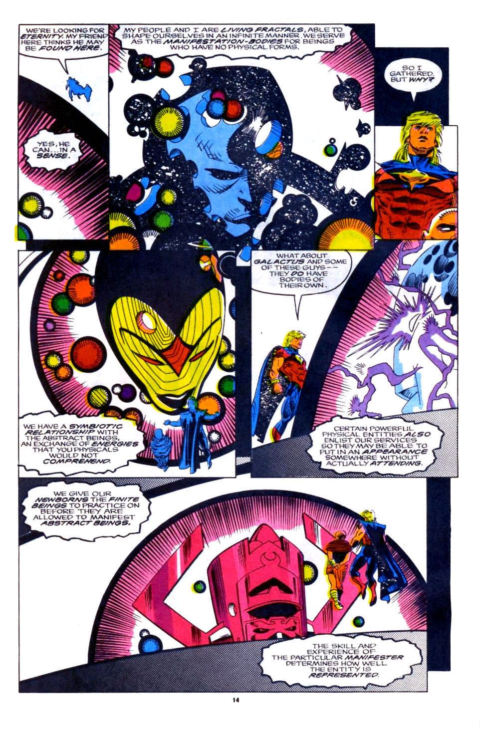 "These entities were designed by Steve (ETERNITY) Ditko and Tom (KISMET) Grummet respectively (I saw the characters as Adam Kadmon, the Cosmic Man of Qabalah and Sophia, the Gnostic Emanation of the Divine). The semi-abstract being appearing as rings around a graphic corona core in background is ANTHROPOMORPHO – a cosmic creation of writer Mark Gruenwald and artist Greg Capullo who first appeared in Quasar #37 in 1989."