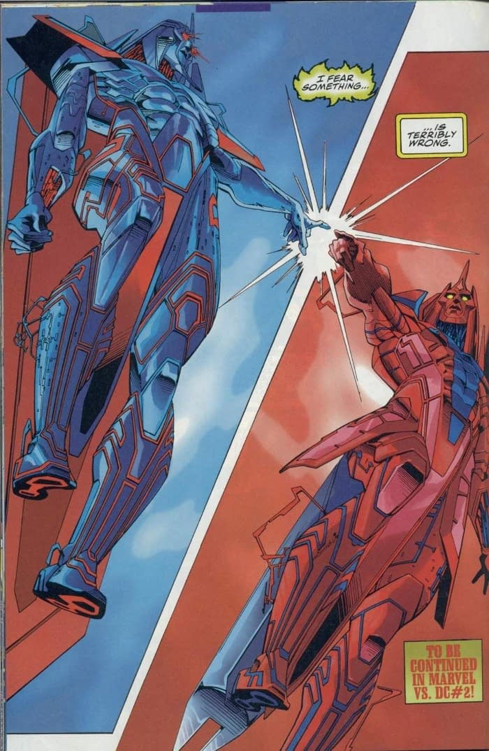 I would like to draw attention to someone else who popped up. Because in another version of the Marvel/DC Comics crossover, DC Versus Marvel #1 from 1995 by Peter David, Claudio Castellini and Dan Jurgens, the Brothers were another pair of cosmic entities that each represent the DC Universe and the Marvel Universe. Being the physical embodiments of their respective Multiverses, both entities are shown as being so immensely powerful that even the Living Tribunal and the Spectre were beneath their notice. In the beginning of their existence, the Brothers encompassed the whole of everything except each other. They could not accept this lack of uniqueness and fought, which unleashed forces which ended the whole of creation and then restarted it, creating the Multiverse, and eventually causing the events of DC Vs Marvel."