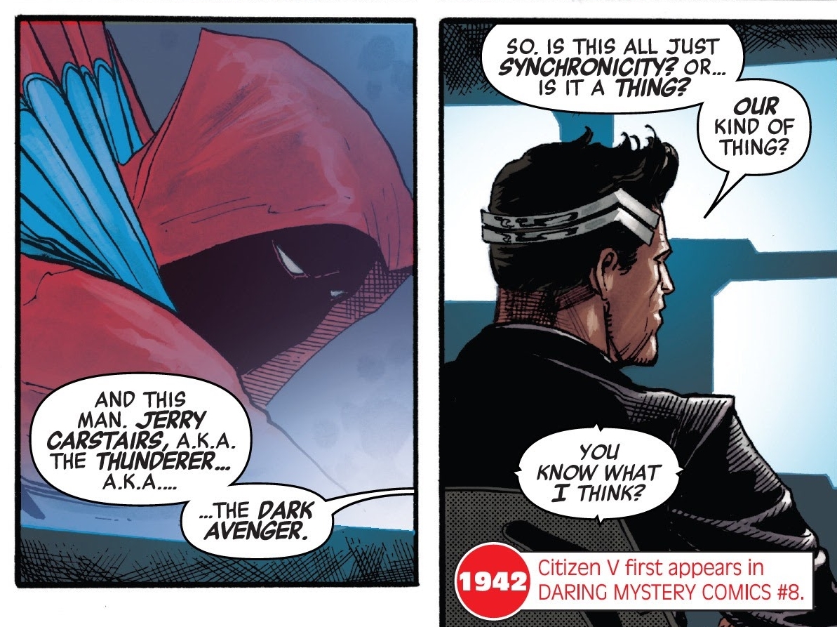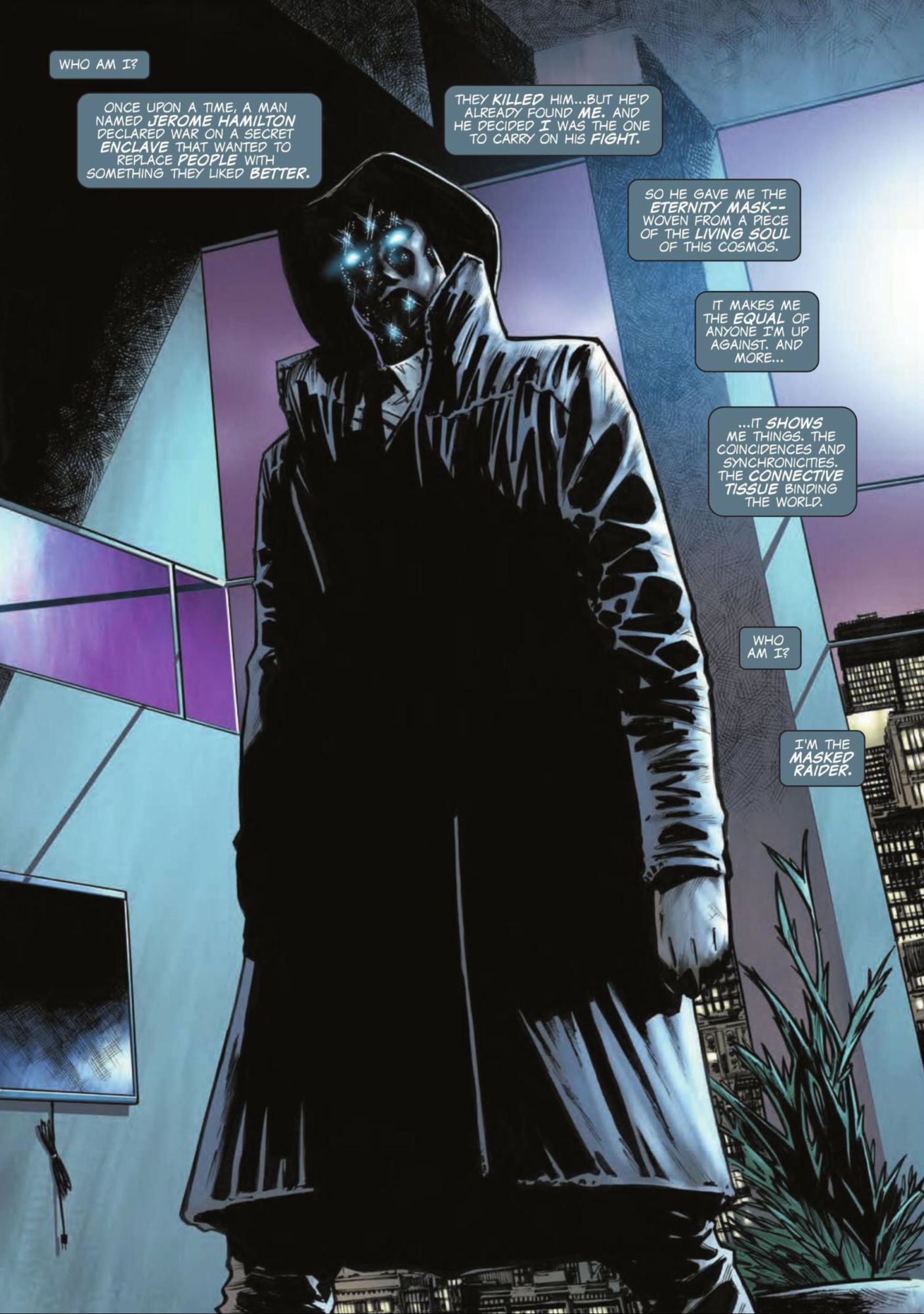 Because the Bleeding Cool preview of Incoming #1 has this Masked Raider tell his story and how he acquired the Eternity Mask. That it not only makes you someone's equal, but it copies the powers of those around him. And the comic uses that phrase, that Bleeding Cool named back in January, that it shows him the Connective Tissue of the stories around him.