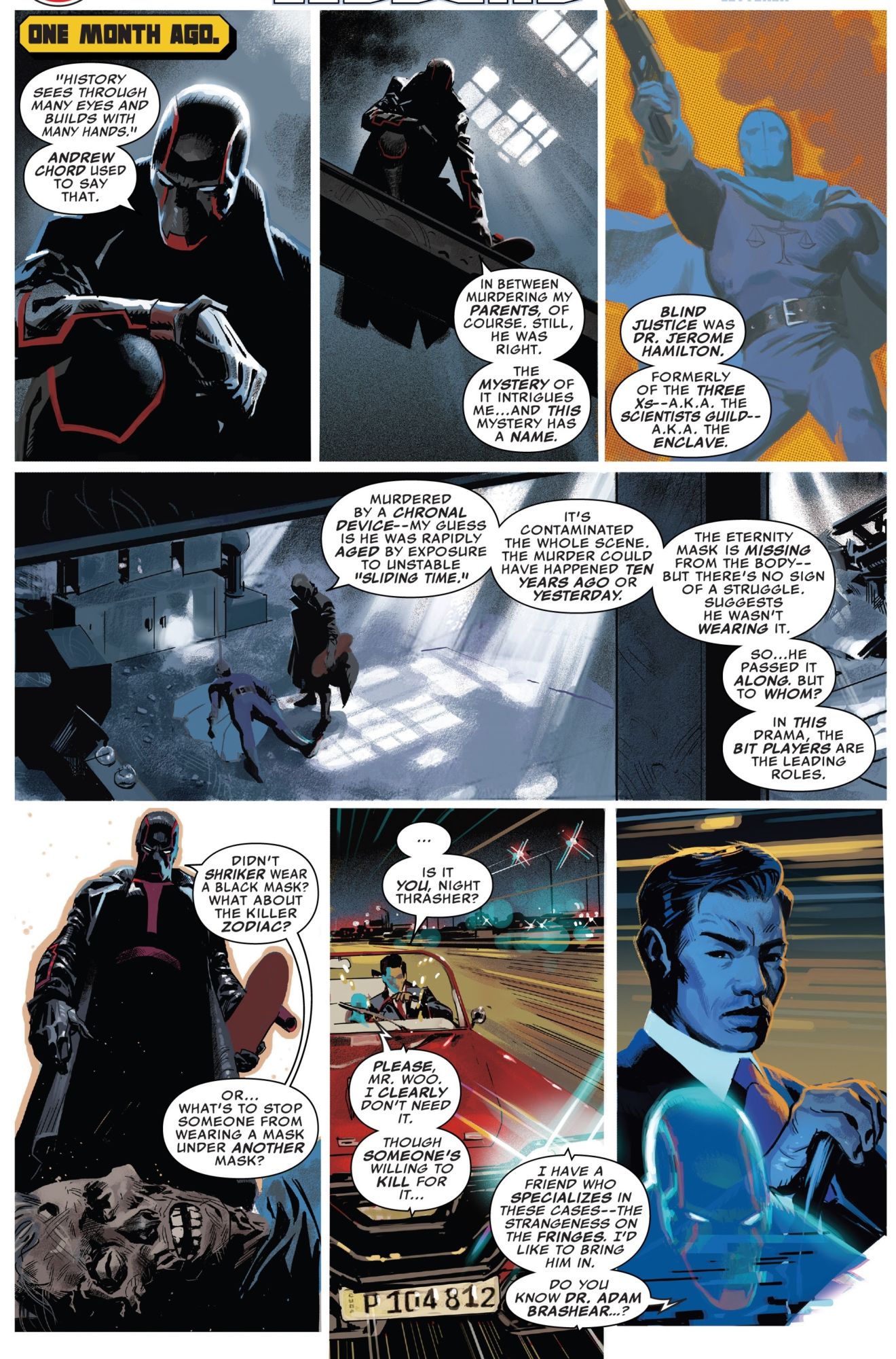 …whether they knew it or not. With many suspects over the decades, through the history of the Marvel Universe, to the present day. And a mystery murdered individual who held the Eternity Mask, taken from him, while Nightthrasher wonders what is happening, retelling the history of the Marvel Universe…