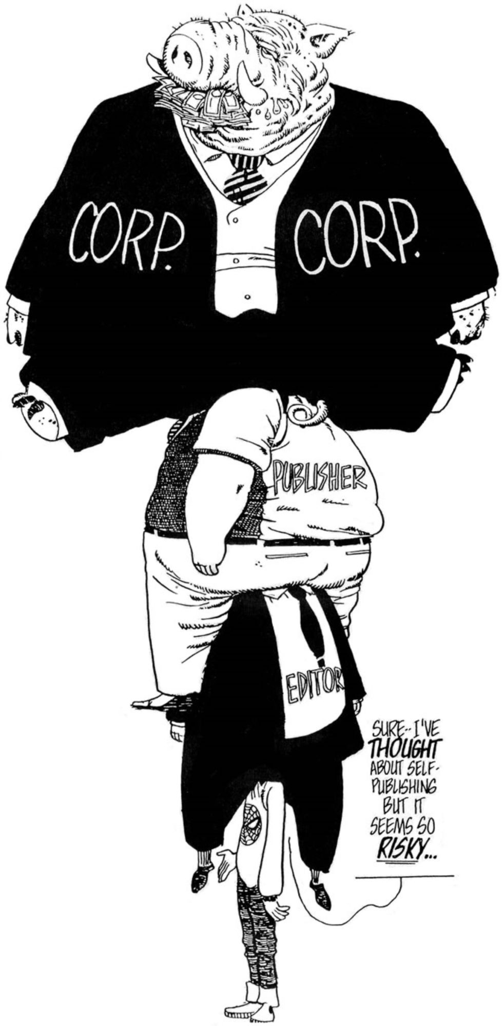 Published in WAP, the comic book professional activist magazine way back in 1988, Dave Sim would later talk about the message in Comics Forum, in 1993, saying "If you picture a multinational corporation as a pyramid, coming down there's a ragged bottom of middle-level bureaucrats, and dangling from the end of one of the strands is an editor. Down below him, trying to reach up, is the creator. An editor is paid a Manhattan salary. Those people leave tips in restaurants bigger than what creators work for. This is why the reward for one of the top creators is always to offer them an editorial position.