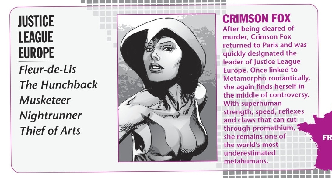 Crimson Fox – member of the Justice League Europe. First appearance in Justice League Europe #6 , they were twins created by Keith Giffen and Bart Sears, perfumers Vivian and Constance D'Aramis who shared the role of Crimson Fox. Superhuman speed and strength, they could emit pheromones to control their assailant.