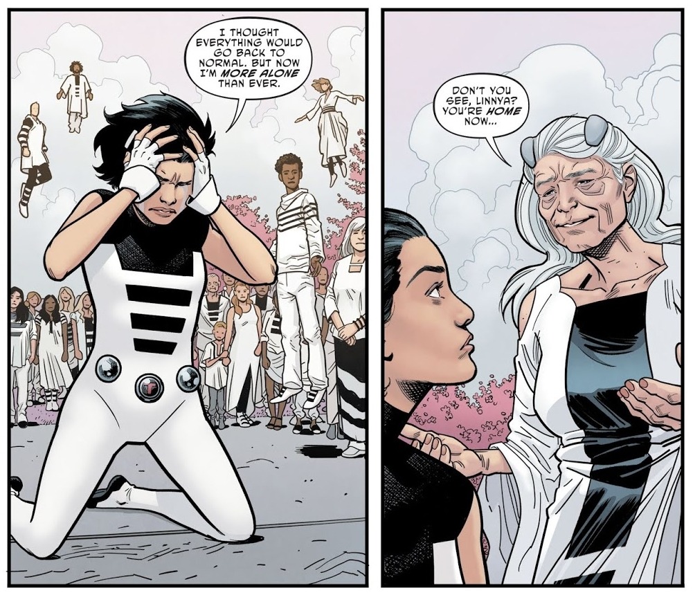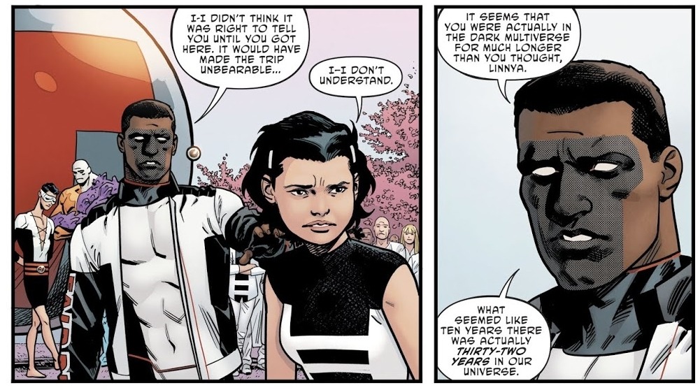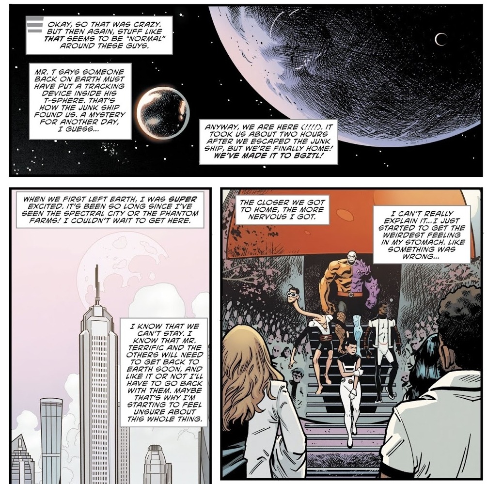 At the end of last week's The Terrifics #4, the team took Linnya Wazzo, the new Phantom Girl, to her home planet of Bgztl, where the population can phase through matter — even dimensions. The artist of the issue, Evan "Doc" Shaner, wanted to draw people's attention to something on the final page.