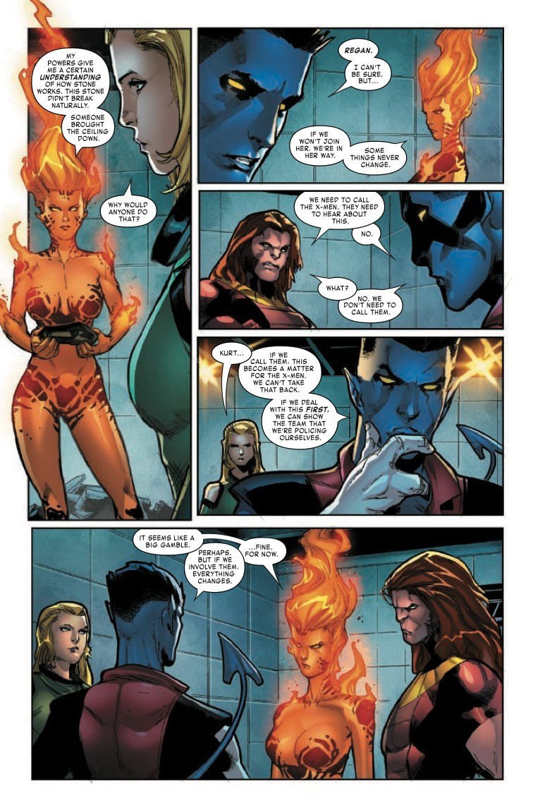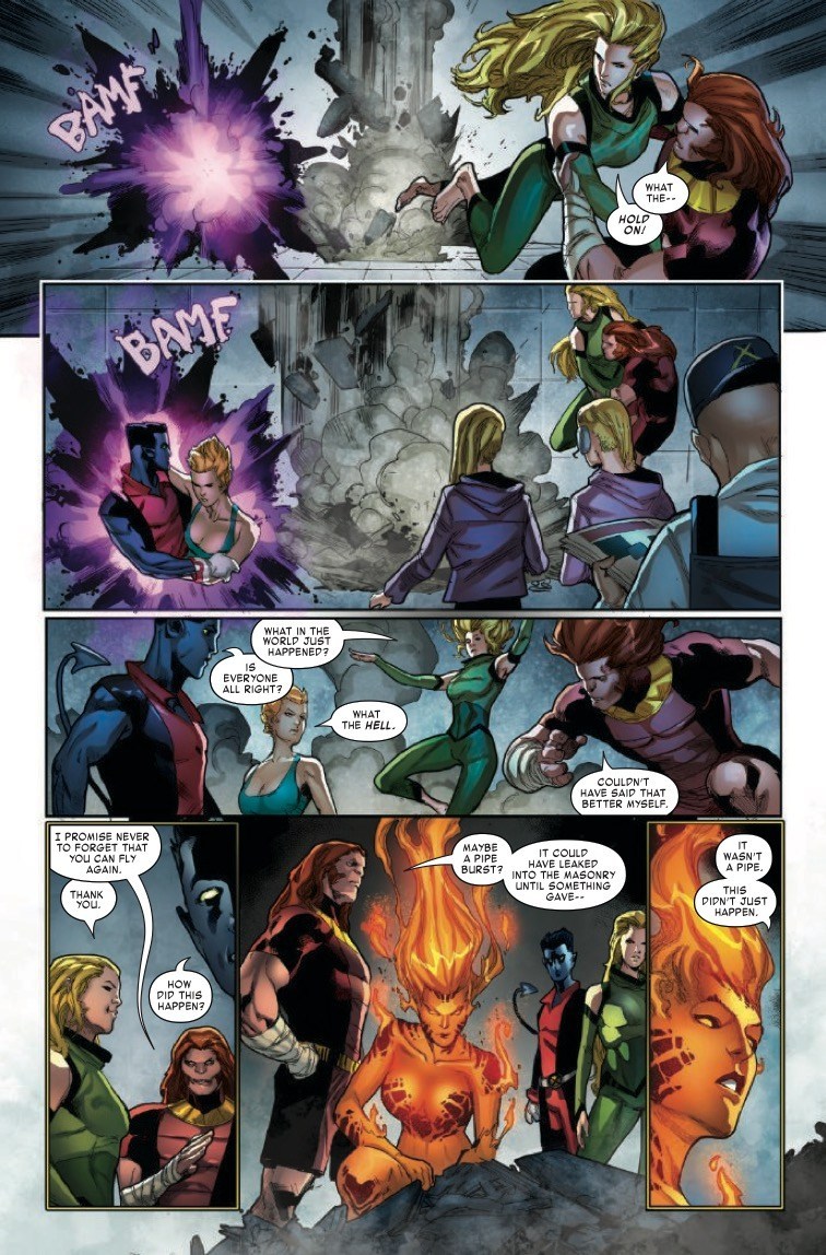 This discussion on equality is interrupted when a sabotaged ceiling comes crashing down, forcing both Meggan and Nightcrawler to spring into action.