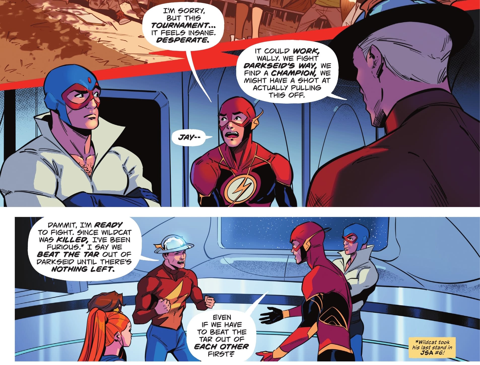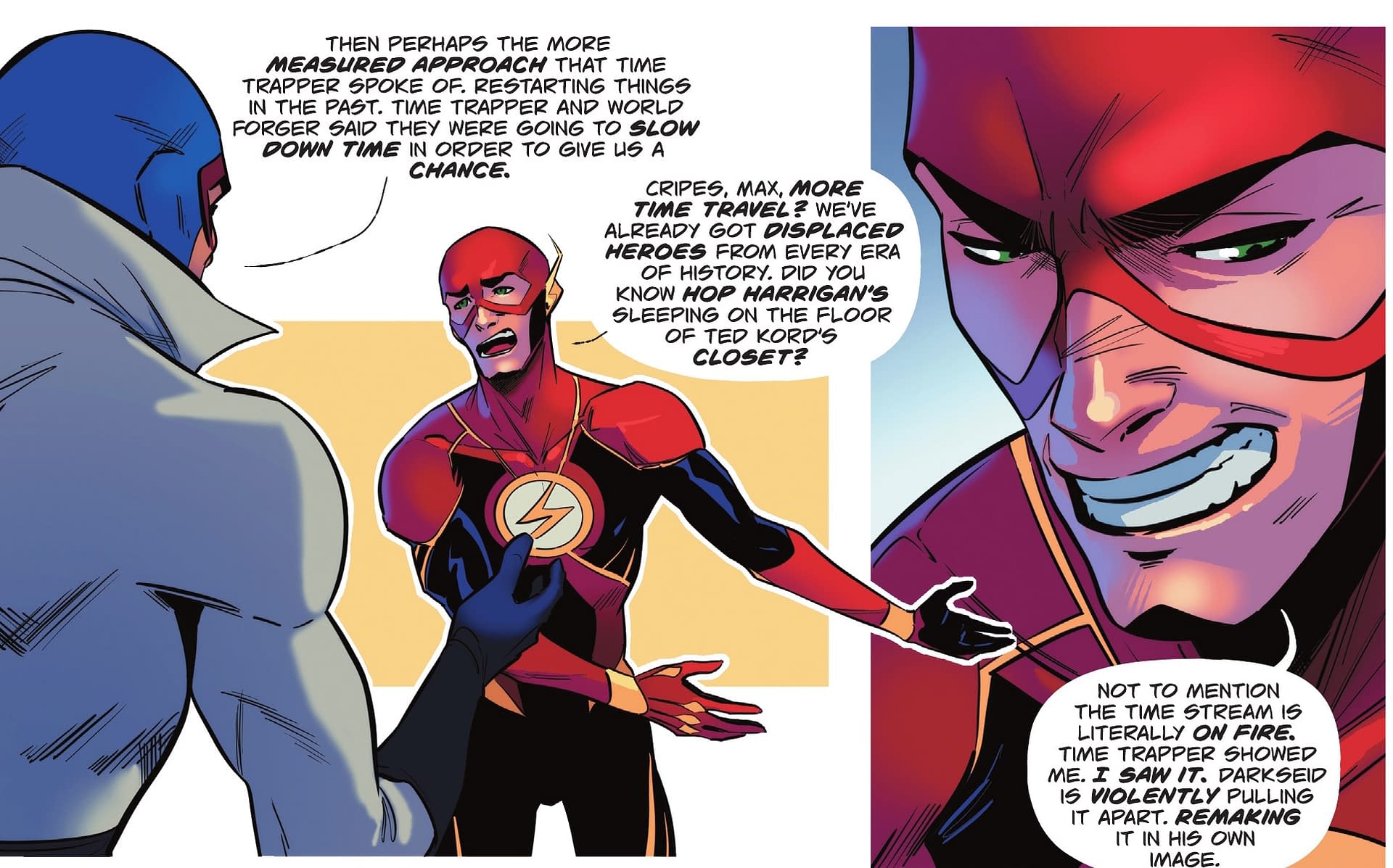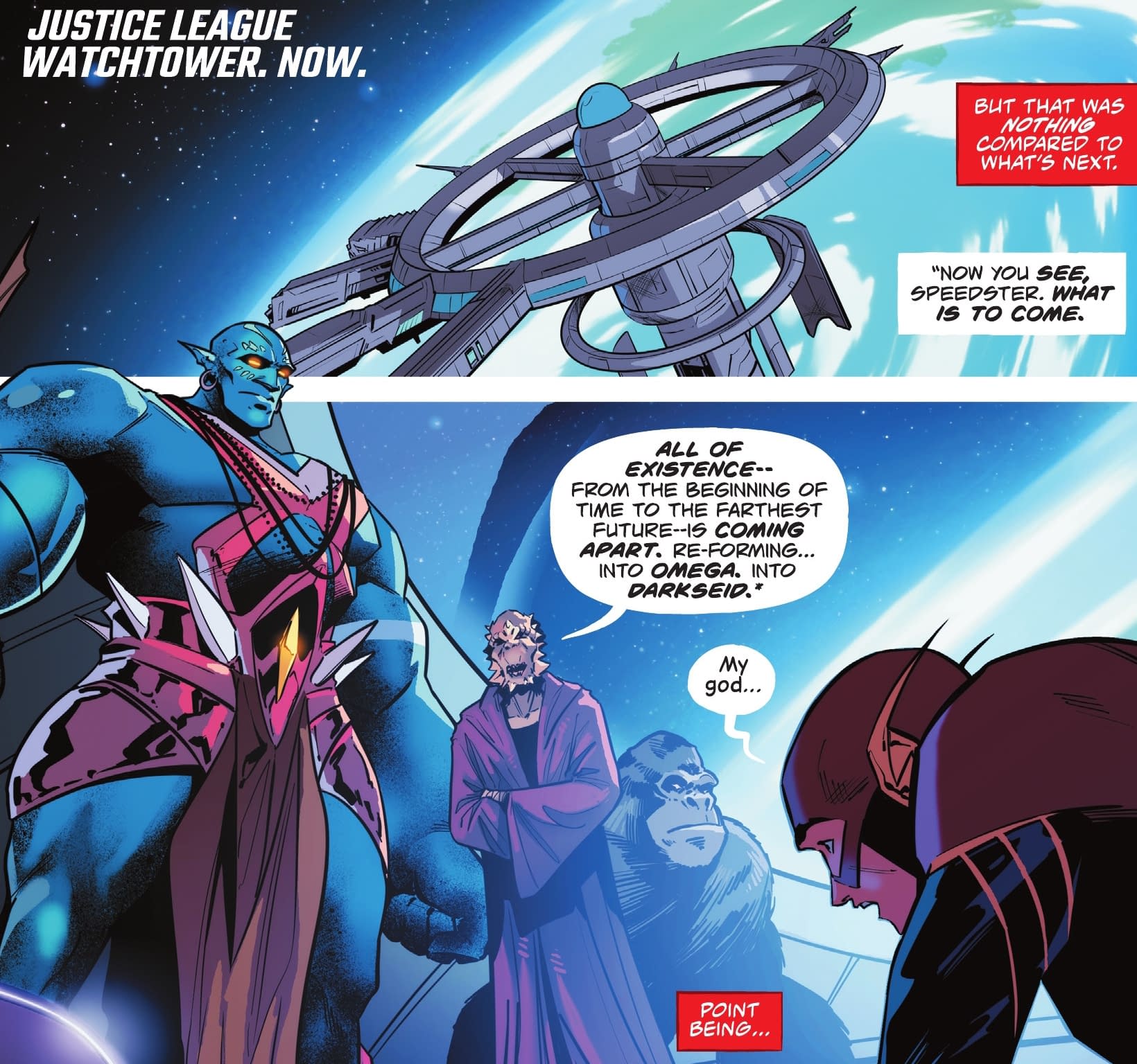 The Flash gatecrashes the big meetings with the Darkseid Time Trapper, which we also see play out in today's Superman.