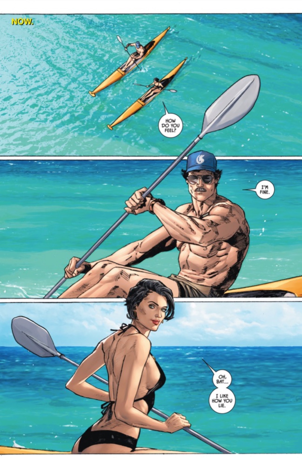 Whatever the case, we've got a very early look at next week's Batman #78, in which we learn that Catwoman must really love Batman… because she'll tolerate him with a mustache. Our preview begins with a page harkening back to Batman and Catwoman's first meeting, way back in Batman #1. It then cuts to the present, as Selina has been nursing a beaten Bruce Wayne back to health while his other-dimensional father and Bane control Gotham City. We find Batman canoeing shirtless, and he's sporting his Matches Malone look, which… gross. But she's remarkably tolerant of it, which is, of course, a sign of the truest of loves.