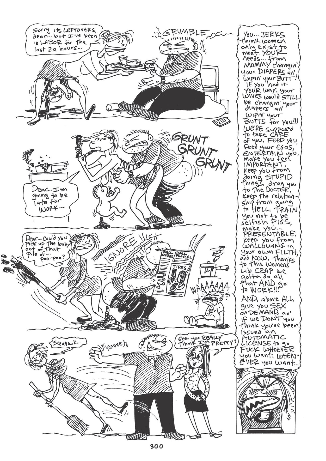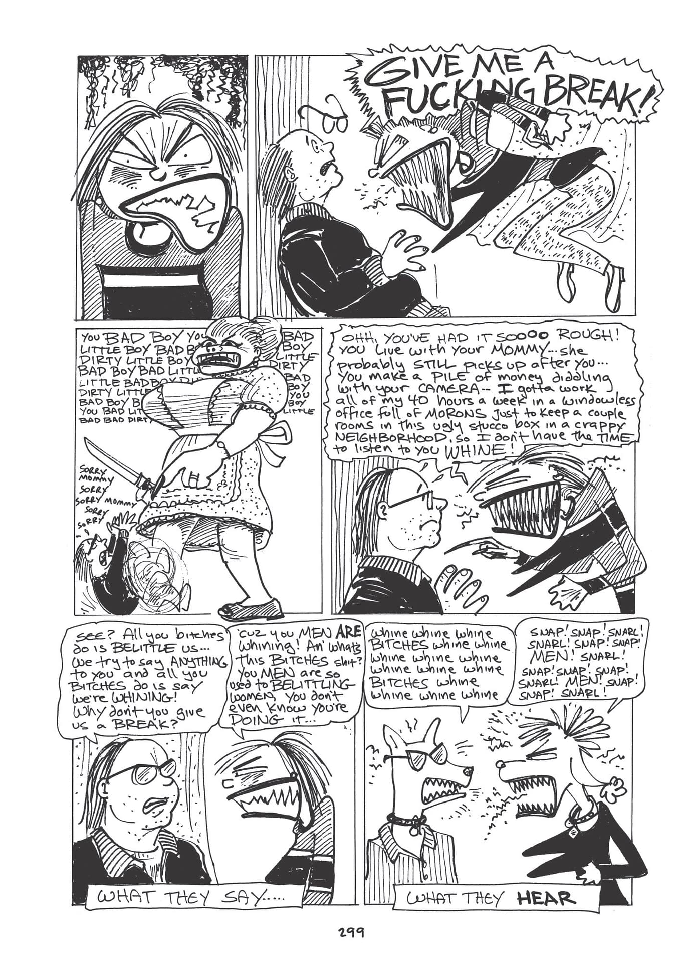 "On one of her rare vacations, Midge abandons her negativity long enough to anticipate meeting a 'nice guy' and 'getting laid' 1990s style, but after one drink too many she ends up with 'Kenney.' When he shows up uninvited at her apartment, it all hits the fan. I was tabling at a comics convention back in the 1990s and a woman picked up one of my comic books and turned to what is now page 300 and showed to her male companion, saying, 'Read this!' She was not smiling. Incidentally, Midge has not seen the last of Kenney."