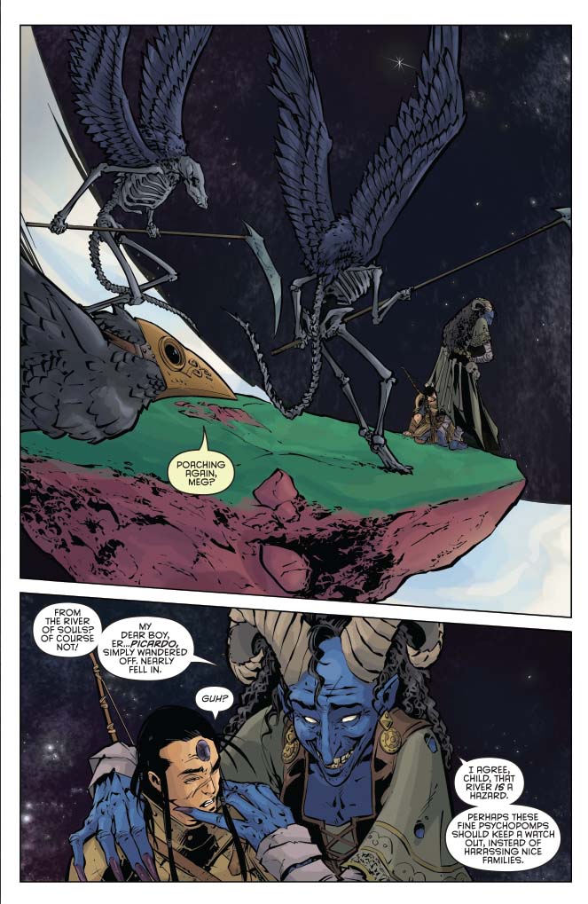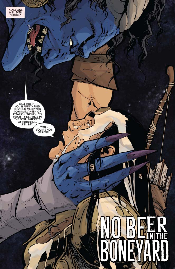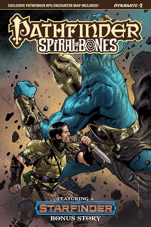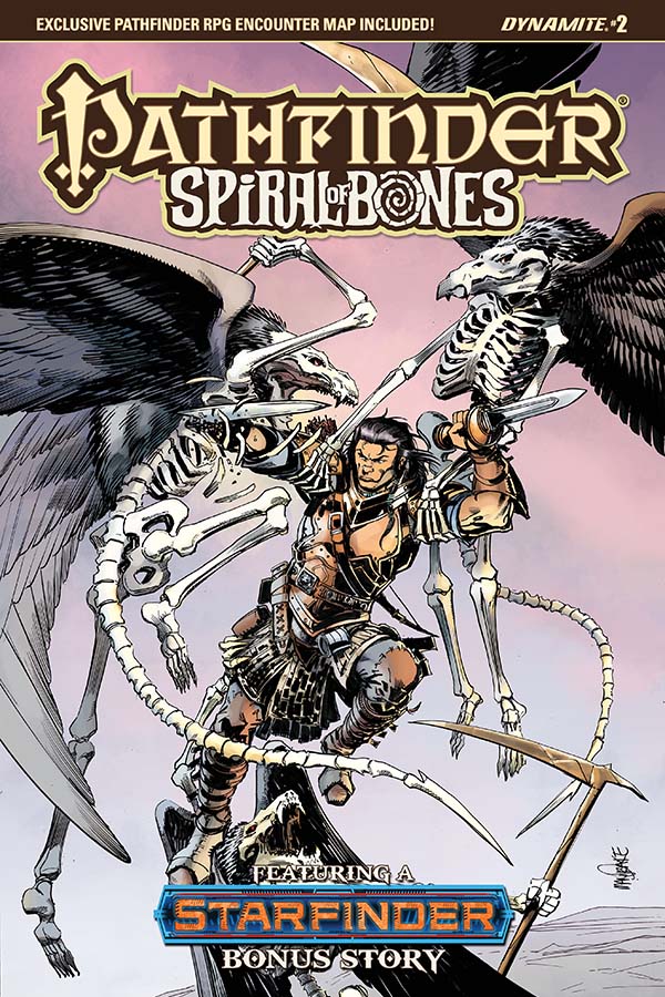 Cocksure fighter Valeros has shuffled off his mortal coil and now finds himself adrift in the cosmos beyond the living world of Golarion! Surrounded by angels and devils hungry for his soul, and without his resourceful friends, Valeros must survive his greatest adventure by his wits alone… a dire challenge indeed! The Spire of Bones story continues in this tale written by Pathfinder developer Crystal Frasier with art by Tom Garcia (Mercy Thompson, Pathfinder: Hollow Mountain). Contains a Pathfinder RPG rules appendix and a bonus pull-out poster map!