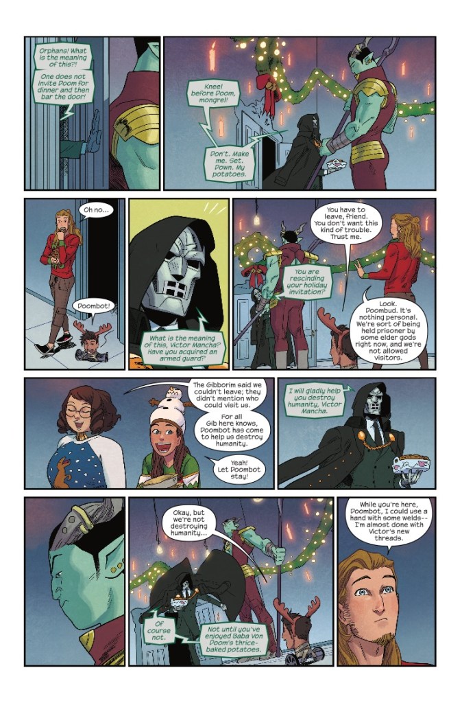 In any case, Nico uses the staff to put up some festive decorations, but would Christmas really be complete without a visit from Victor's friend, Doombot? Of course not!
