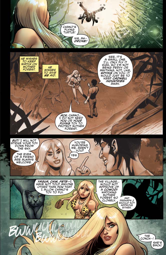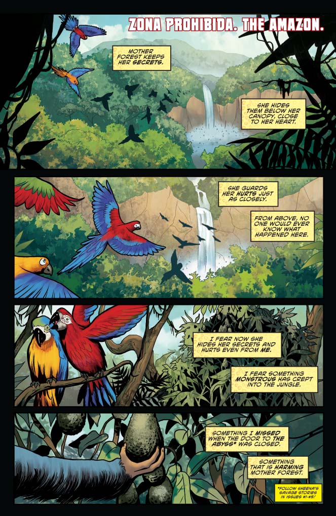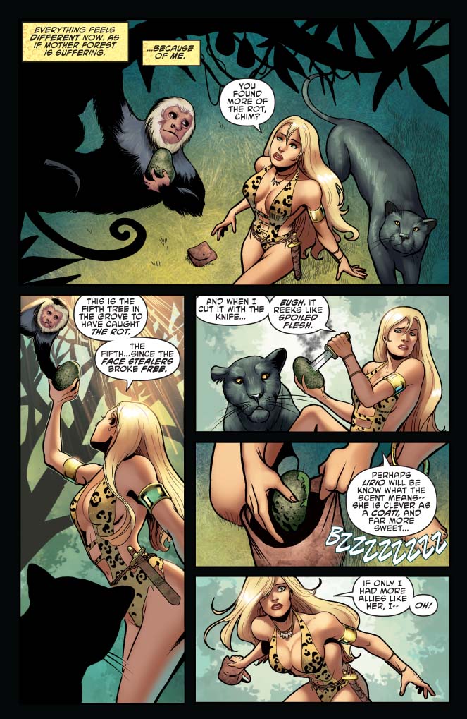 NEW STORY ARC! The start of a bold new adventure! Mother Forest is beset by a terrible plague that sickens the very jungle, but this deadly evil is not the only danger Sheena must face. A ruthless huntress prowls the forest, seeking a girl with golden hair, and the mark of the jaguar…