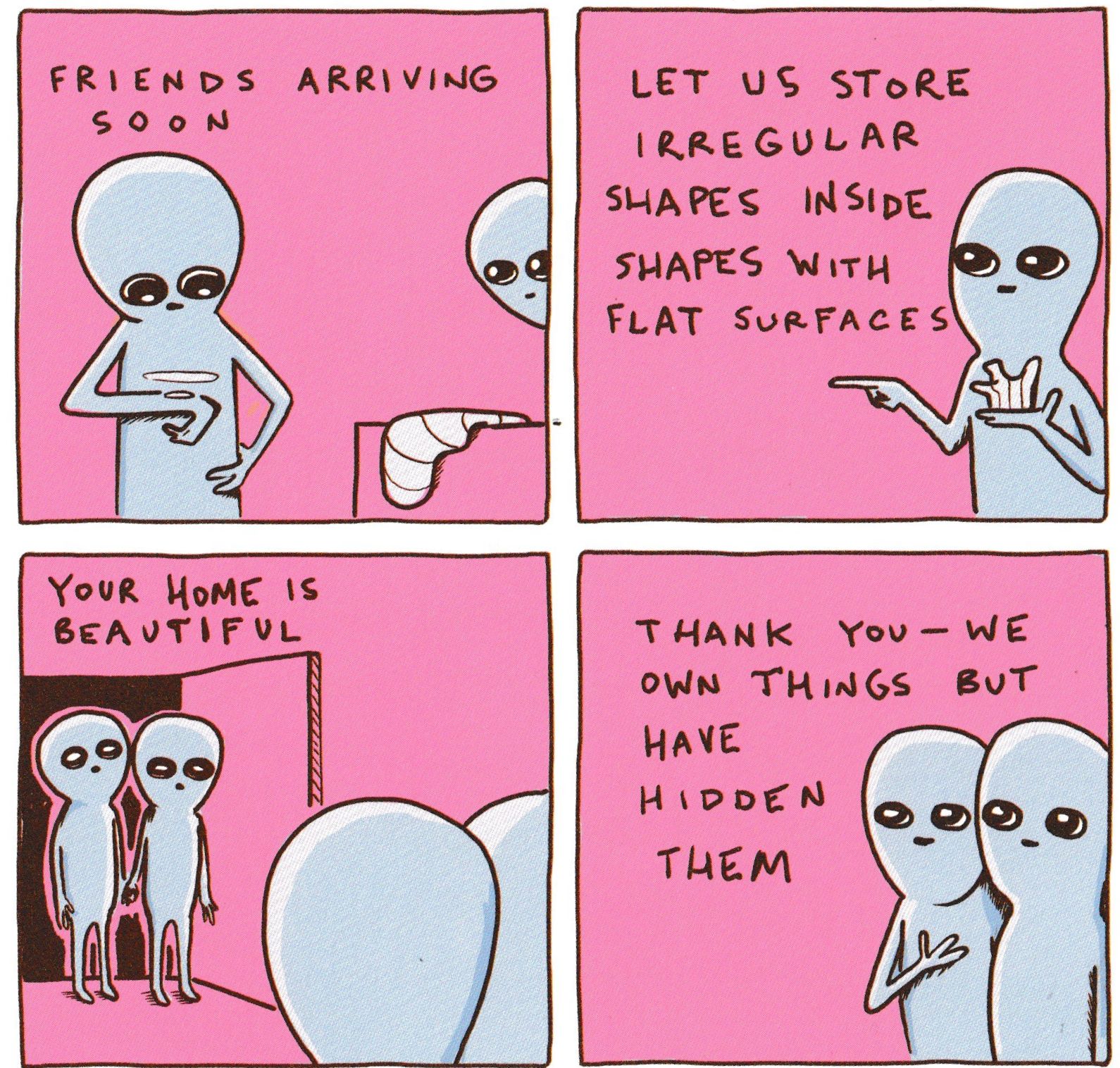 Nathan W Pyle has been running Instagram comic for a few years. Publisher Wildfire in the UK and HarperCollins in the US (I got the former, obv) has taken those cartoons and put them in a nice square hardcover book. And it's a transformative experience, no longer mixed up with images of cats, photos of people in Moscow or ladies' bottoms. So for the first time, I read Strange Planet as a whole narrative – even though it was never meant to be one. And some brand new pages added to help smooth the transition, fill in gaps and tell new stories. And it's a way of seeing our own lives through the eyes of others – 'friends arriving soon' 'let us store irregular shapes inside shapes with flat surfaces' 'your home is beautiful' 'thank you – we own things but have hidden them' – is a stand out for me, and also encapsulates what is so loveable about this book.