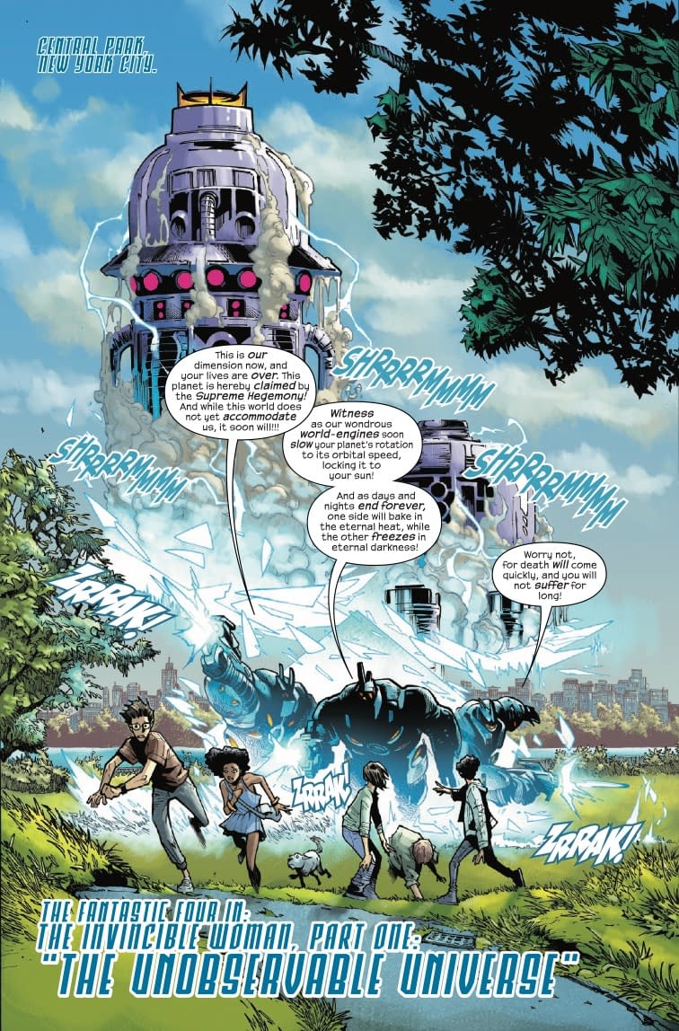 Extremophile aliens want to stop Earth's rotation in Fantastic Four #6! Can Reed's family save the planet before it becomes a rotisserie chicken?