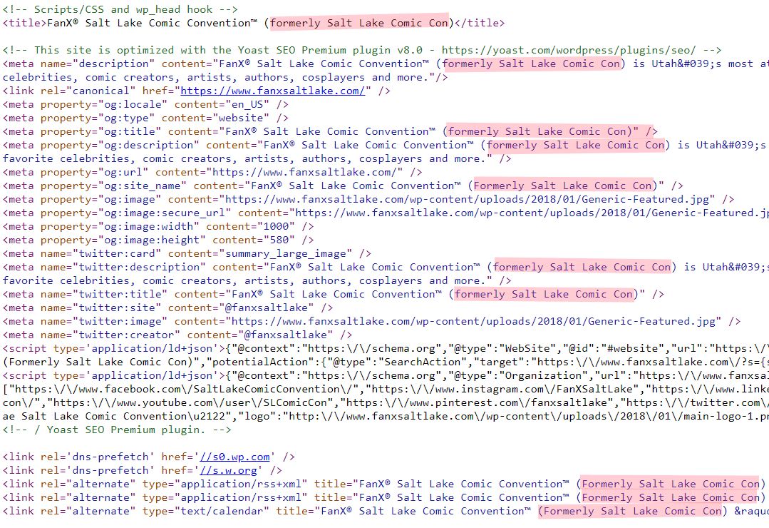 But hey, that's not their fault, right? It's Google's fault, yes? Well, to a point. You can remove or alter such Google search results by filling in forms and the like. But what doesn't help is when your website's actual source code still says Salt Lake Comic Con and "(formerly Salt Lake Comic Con)" repeatedly. Just from one screengrab: