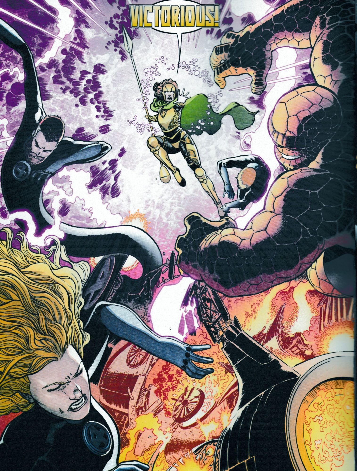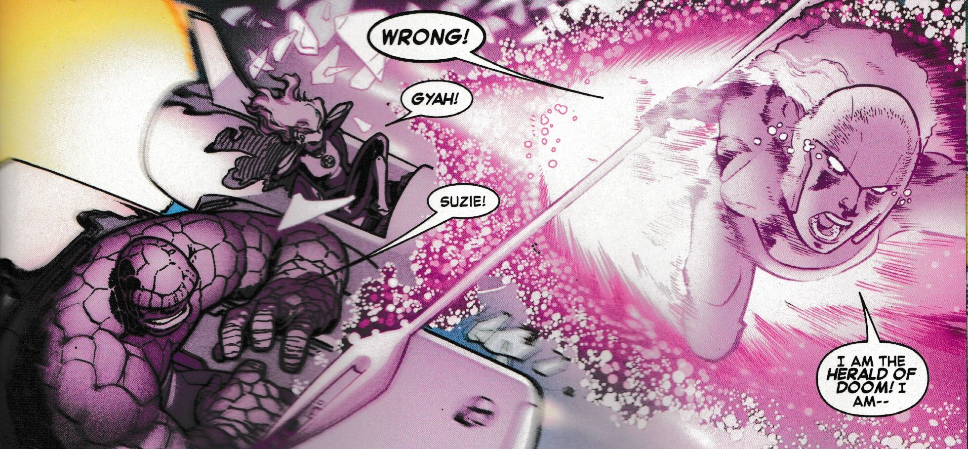 Indeed she is. And nice new duds, folks. But here's the thing–is that her name? For readers, it clearly is, she has a logo. But for anyone else, that sounds more like premature bragging, Doom-style. But for the FF?