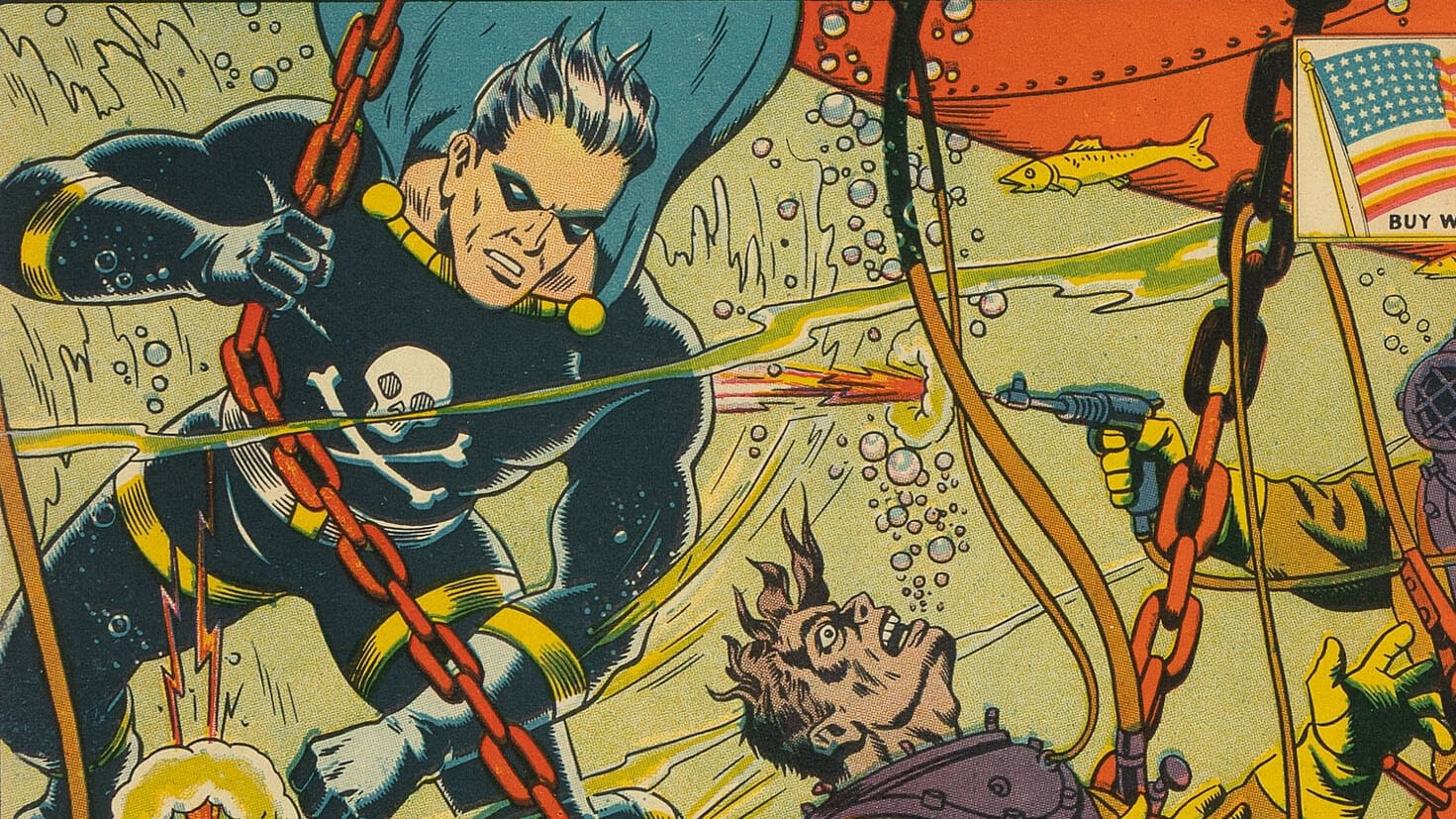 Exciting Comics #28's Black Terror cover by Alex Schomburg is one of the 44 fabled Gerber "white space" covers.