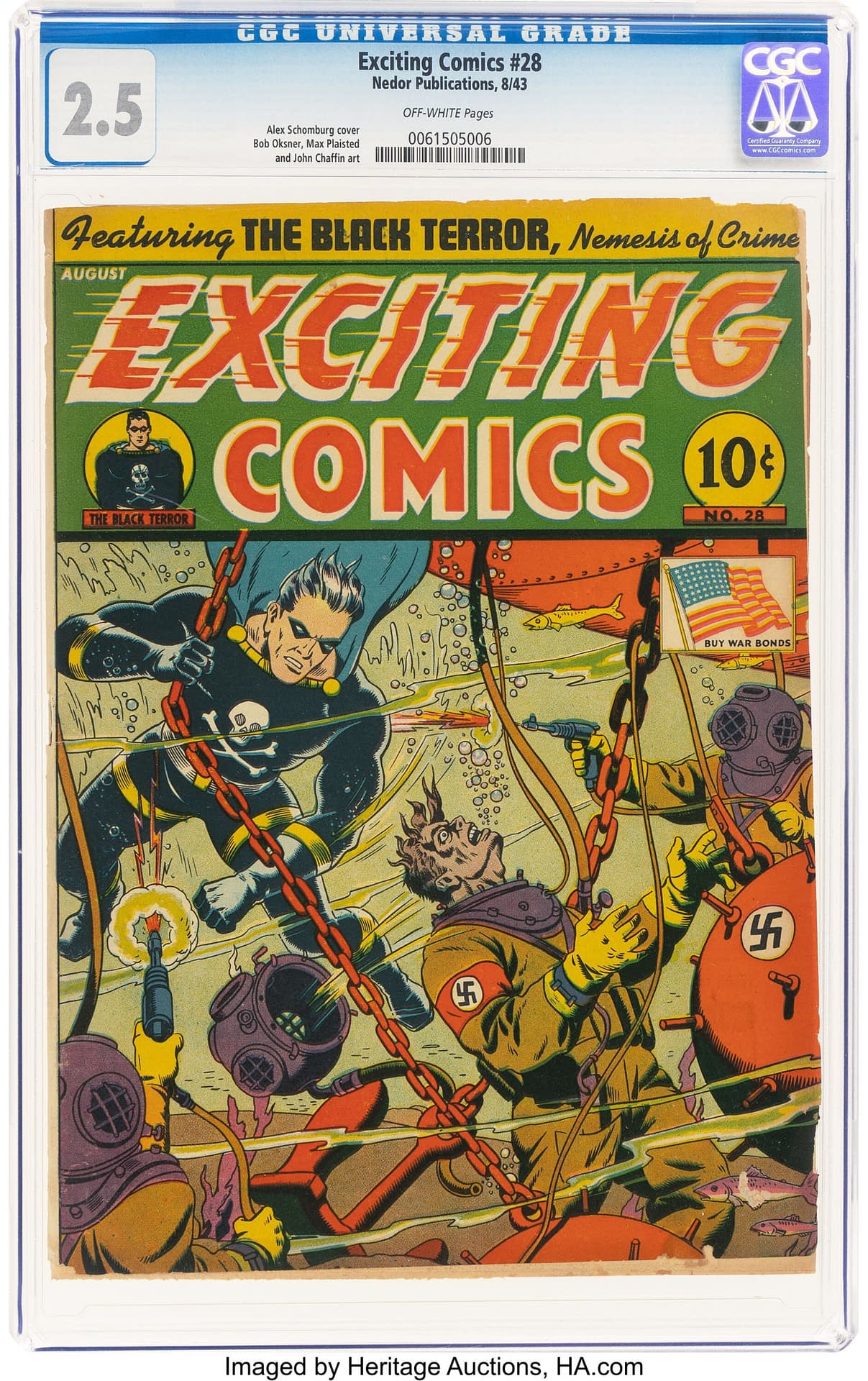 - Exciting Comics #28 features a wartime Alex Schomburg Black Terror cover tied to key 1943 World War II events.