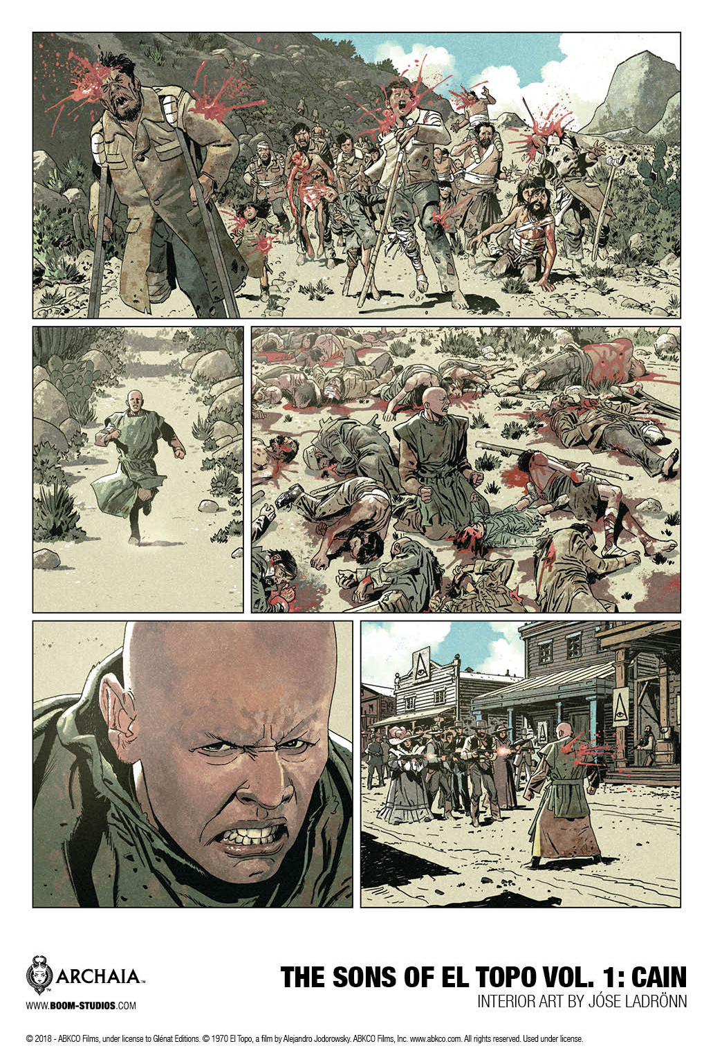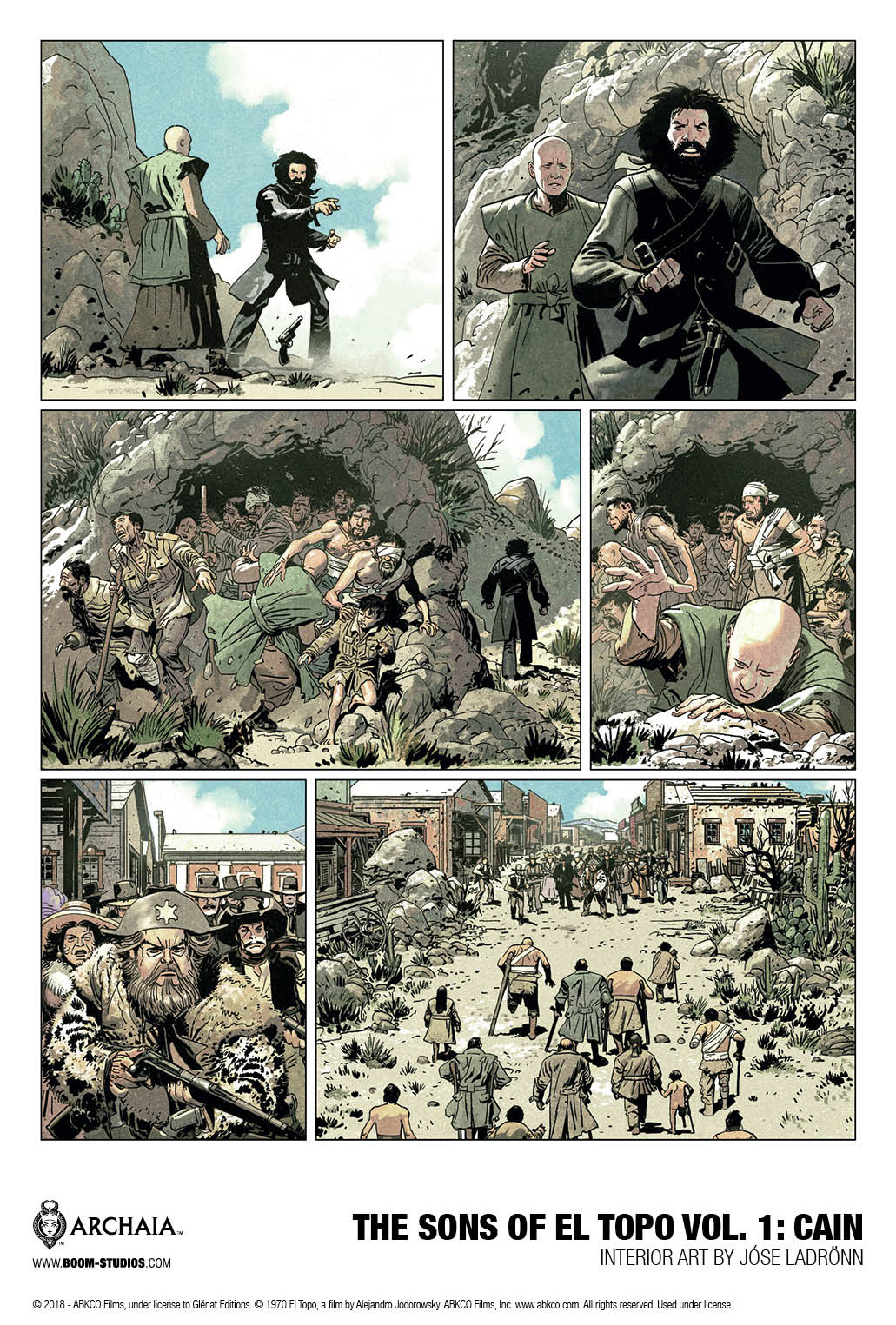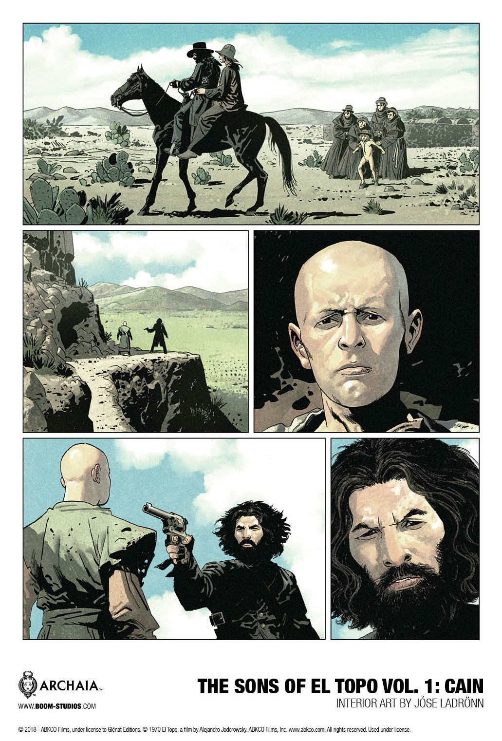 BOOM! Studios has unveiled a first look preview at The Sons of El Topo Volume One: Cain, the sequel to the cult classic movie El Topo and written by Alejandro Jodorowsky, who wrote, scored, directed, and starred in the 1970 film, with art by José Ladrönn. A press release provides the finer details: