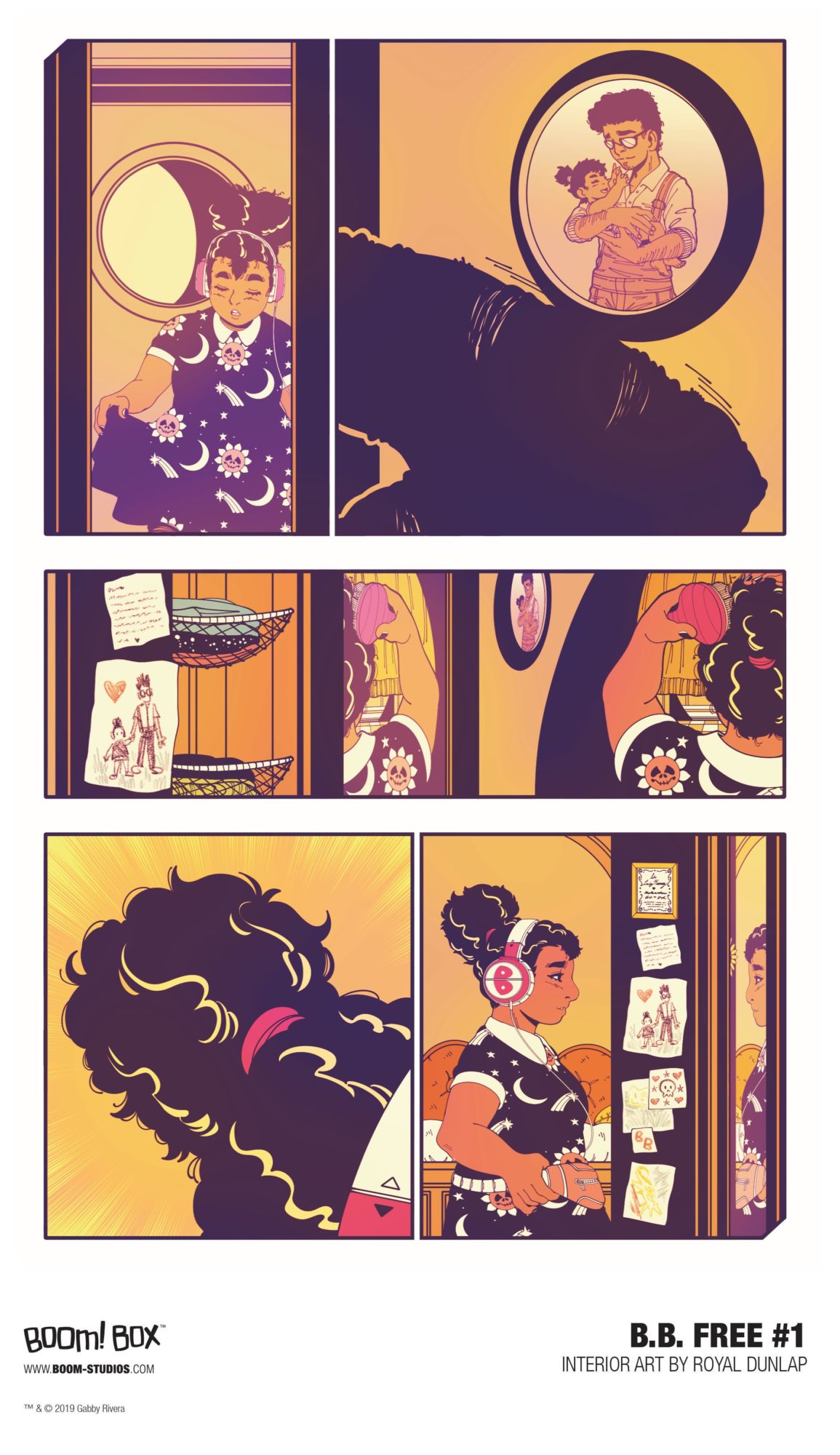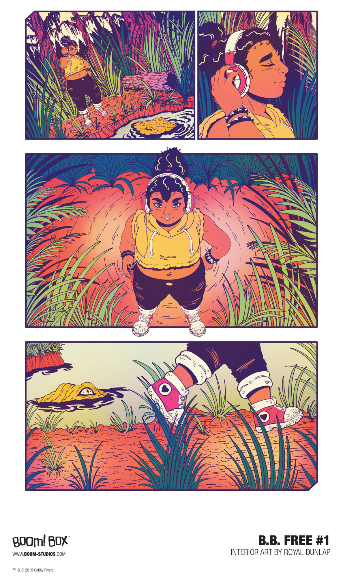 Explosive publisher BOOM! Studios has unveiled a first look at b.b. free #1, the new comic by Gabby Rivera and Royal Dunlap to be published in November on BOOM!'s portable audio device themed imprint, BOOM! Box. Billed as "an adventure about finding your strength and your truth when the whole world is against you," the comic sees acclaimed author Rivera return to comics with her first new series since Marvel's America.