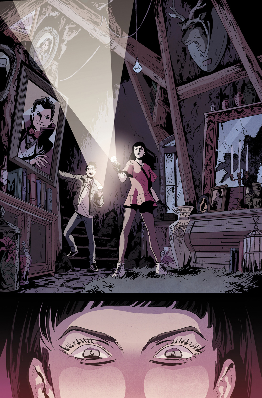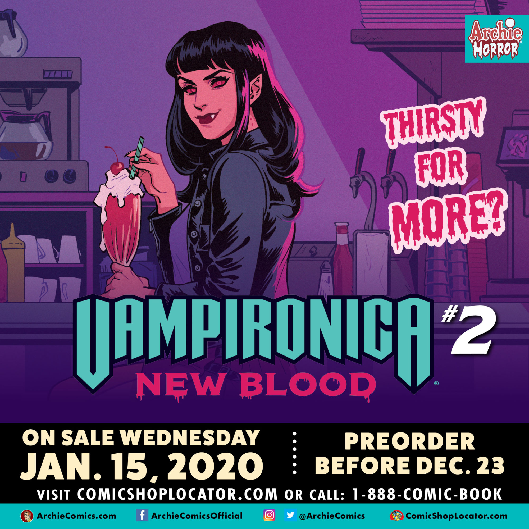 Ahead of final order cutoff on Christmas Eve Eve, Archie Comics has released a first look, unlettered preview of Vampironica: New Blood #2, by Frank Tieri, Michael Moreci, Audrey Mok, Lee Loughridge, and Jack Morelli. The mini-series is Archie's second attempt at getting a Vampironica series out on time in the company's beleaguered horror line, the critical acclaim of which is matched only by its propensity for delays. So far, so good, so be sure to let your retailer know you want a copy by Monday, December 23rd so we don't jinx the whole thing. Vampironica: New Blood #2 hits stores on January 15th.