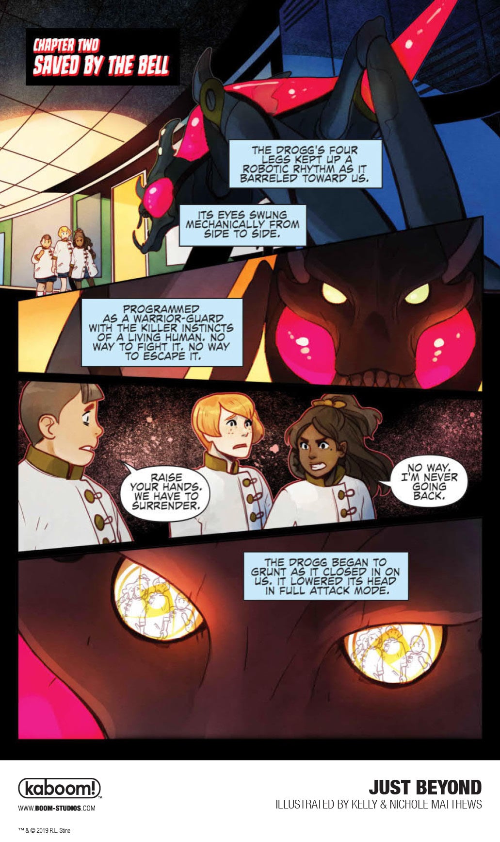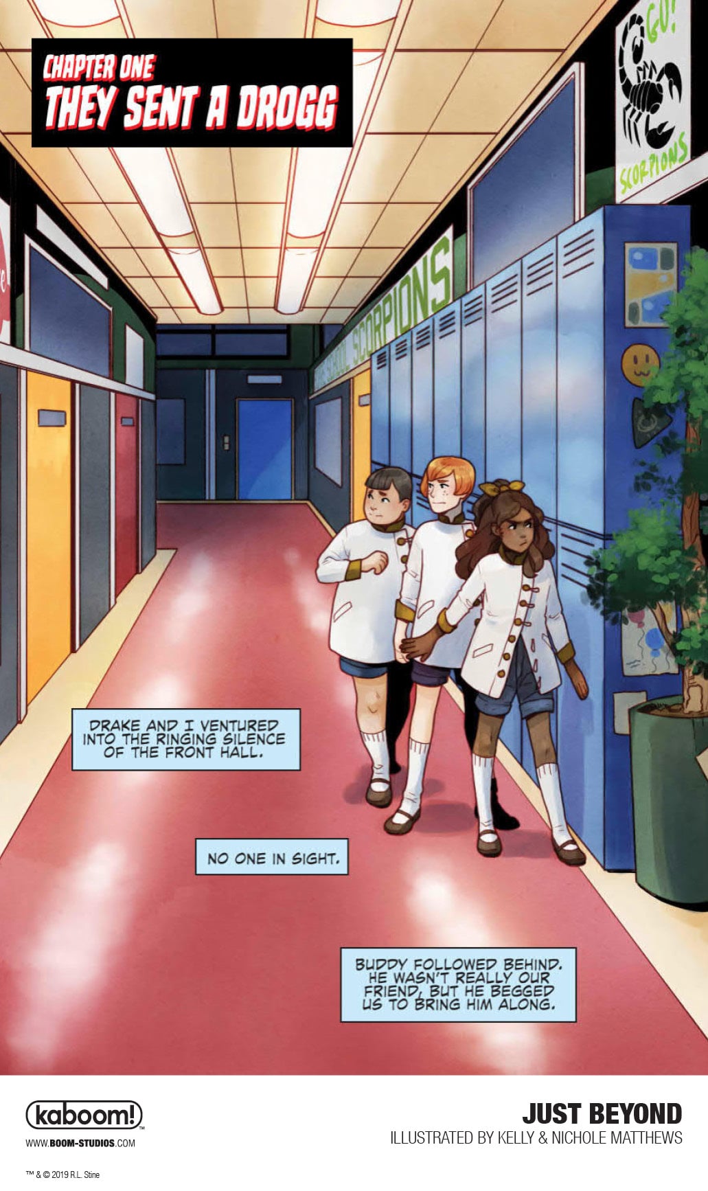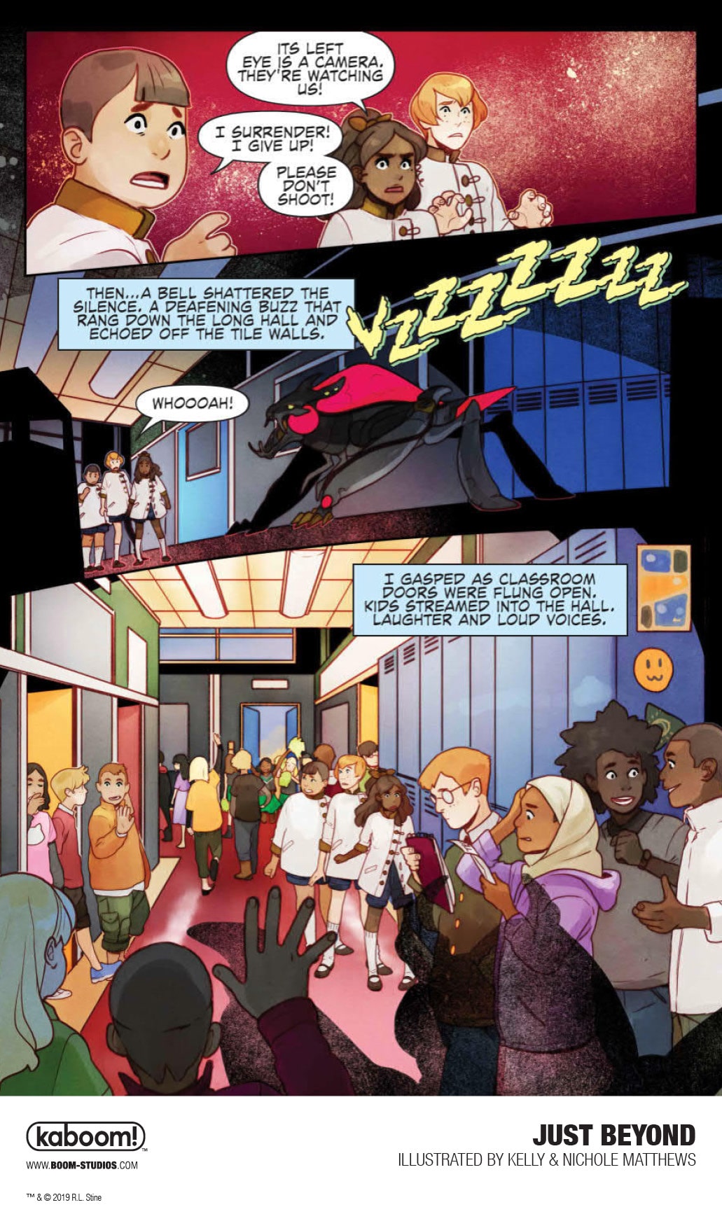 In JUST BEYOND: THE SCARE SCHOOL, the first original graphic novel in the series, something's not quite right as we meet three 12-year-olds in strangely old-fashioned clothing creeping through the halls of Scare Middle School and trying to blend in with the present-day students while evading a menacing cyborg creature, the Drogg. Where did they come from? And why is this scary mechanical monster hunting them down? Thrust into the middle of this terrifying mystery are three modern day students, Josh, Jess, and Marco, who end up fighting for their lives while trying to escape the very nightmare that the three kids in old-fashioned dress were fleeing from, a school of horrors that exists JUST BEYOND their very own.