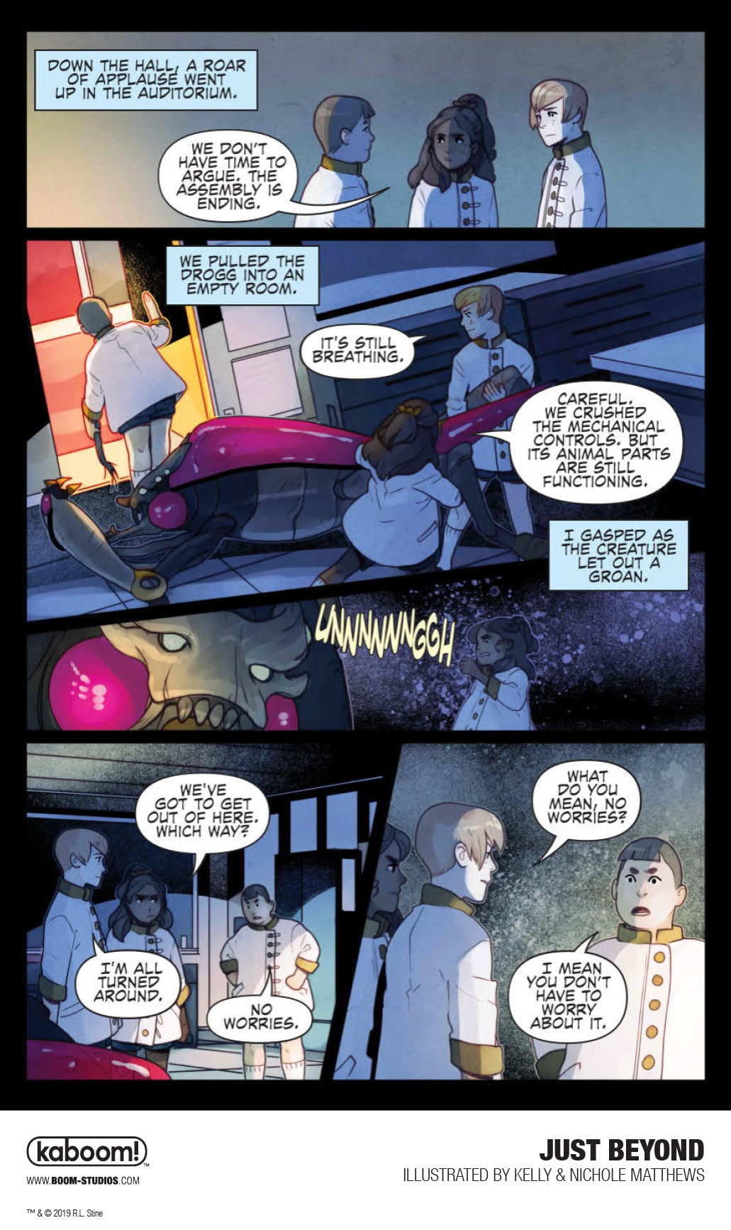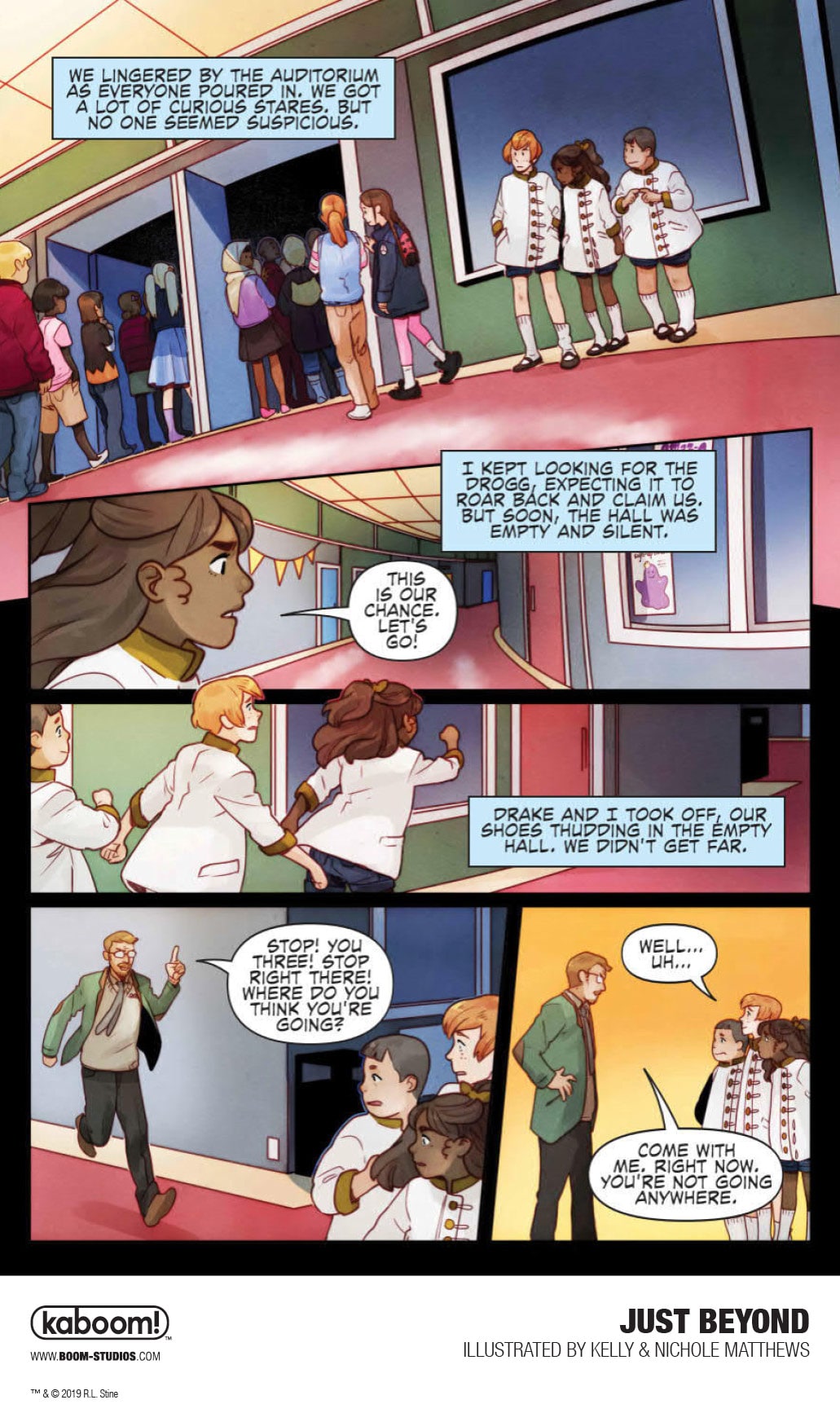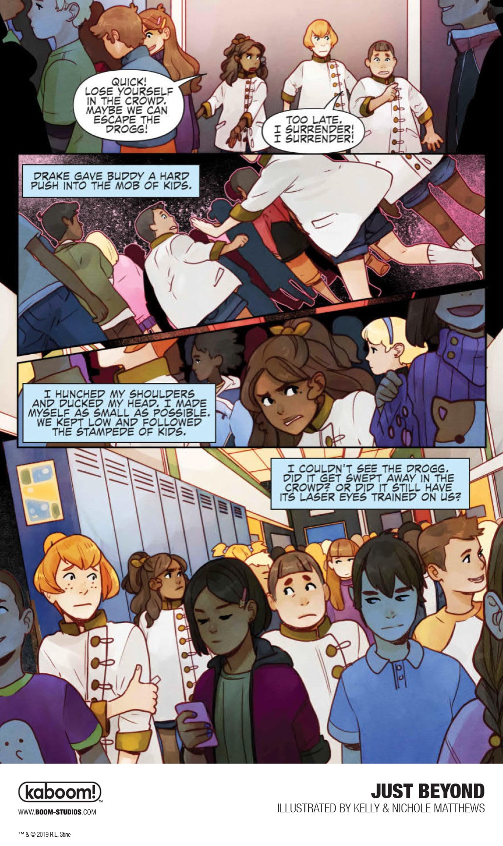 In JUST BEYOND: THE SCARE SCHOOL, the first original graphic novel in the series, something's not quite right as we meet three 12-year-olds in strangely old-fashioned clothing creeping through the halls of Scare Middle School and trying to blend in with the present-day students while evading a menacing cyborg creature, the Drogg. Where did they come from? And why is this scary mechanical monster hunting them down? Thrust into the middle of this terrifying mystery are three modern day students, Josh, Jess, and Marco, who end up fighting for their lives while trying to escape the very nightmare that the three kids in old-fashioned dress were fleeing from, a school of horrors that exists JUST BEYOND their very own.