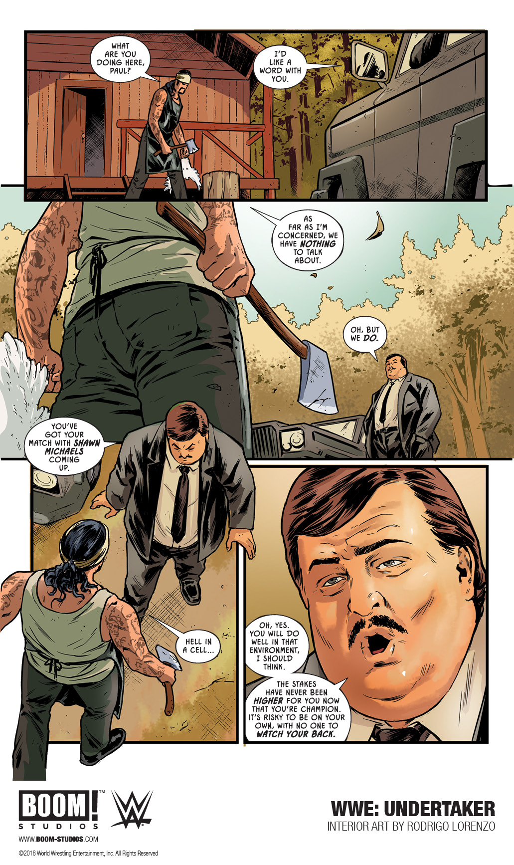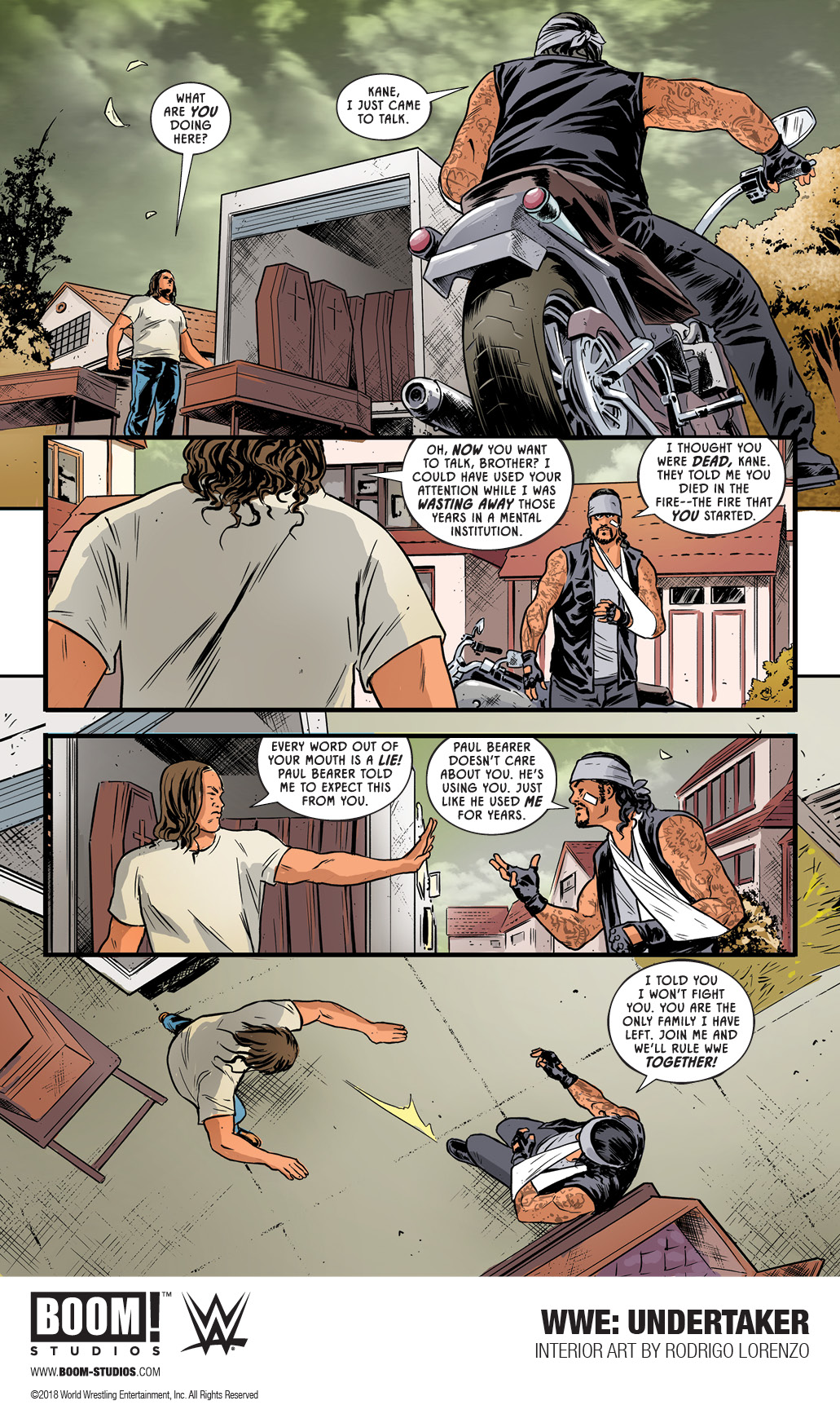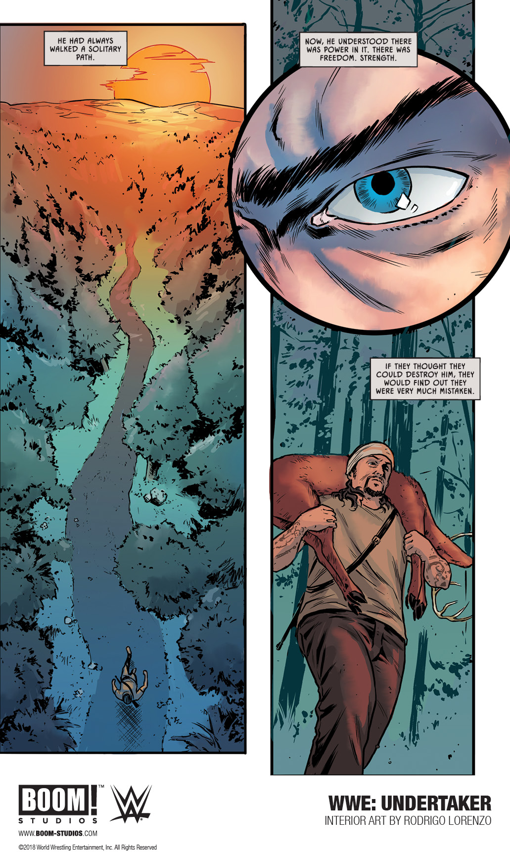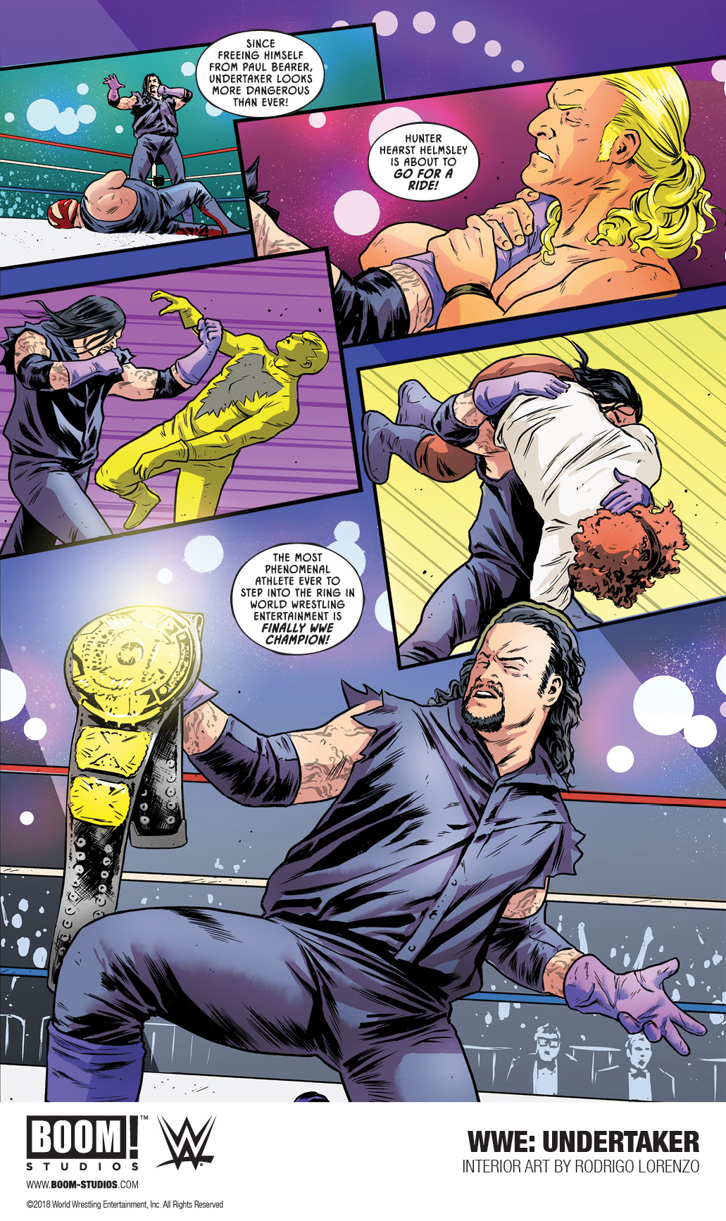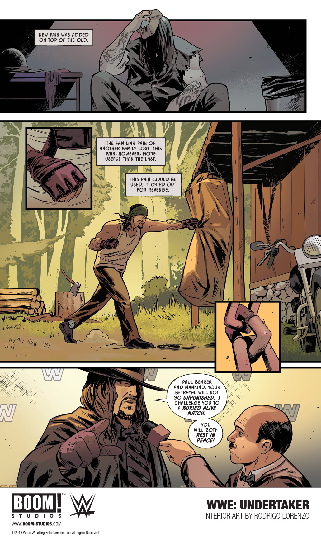 Explosive publisher BOOM! Studios has released a first look preview at Undertaker: Rise of the Deadman. Despite the title, BOOM! and WWE are not taking a cue from Batman Damned and showing the Undertaker's penis in this autobiographical graphic novel. Well, as far we know. Instead, the graphic novel chronicles "the unrivaled career of The Undertaker, with new revelations and surprises about some of the most pivotal moments in his more than twenty-five year history in WWE."