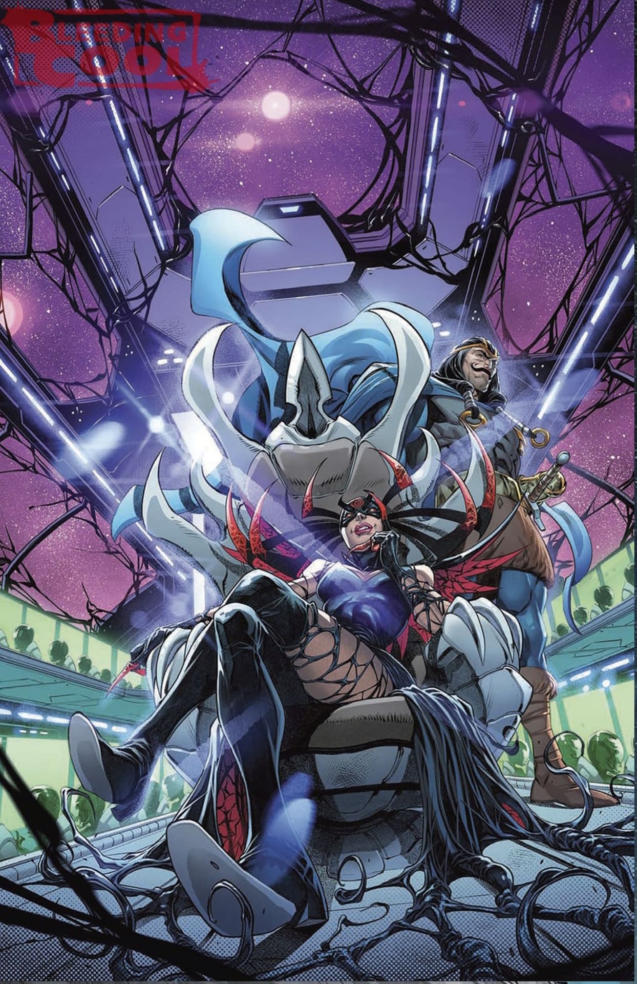 Queen In Black #1 by Al Ewing and Iban Coello is published on the 1st of July, 2026 after an intro story for Free Comic Book Day Comics Giveaway Day on the 2nd of May. With Knull, the King In Black and god of the symbiotes, versus Hela, Queen of Hel, but also now the new Queen In Black – as well as the Son of Venom in the middle (is that how Dylan Brock makes it out of Death Spiral?) And Bleeding Cool has a first look at a few unlettered pages, and in some cases, uncoloured pages, with figures spotlighted…